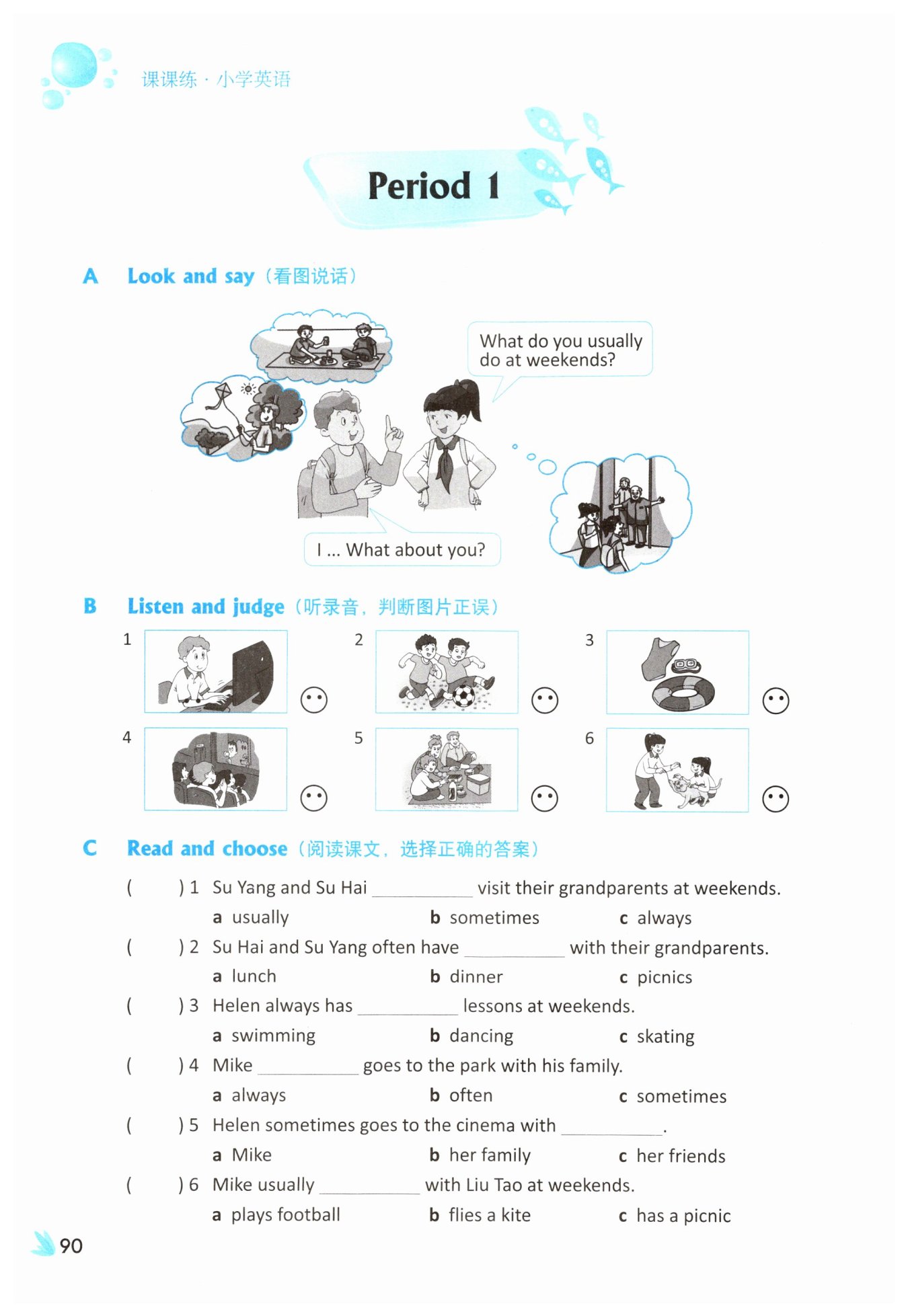 【解析】:本題考查的是看圖說話,主要圍繞周末活動的話題展開。需要根據(jù)圖片中的提示和對話內(nèi)容,描述出圖中人物在周末通常做什么。圖中給出了三個場景:野餐、放風(fēng)箏和看望祖父母,以及對話中的提示“What do you usually do at weekends?”和“I ... What about you?”。