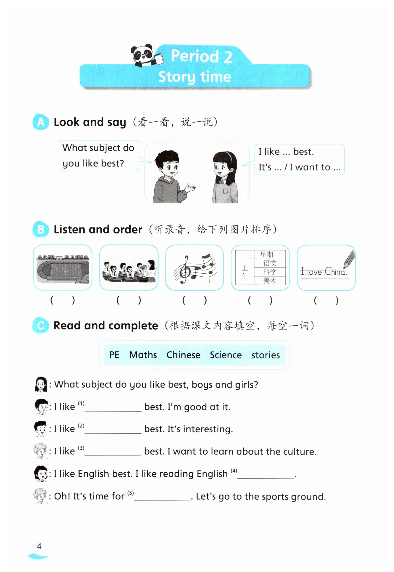 【答案】:I like English best. It's interesting. / I want to read more English stories. (答案不唯一,合理即可。)