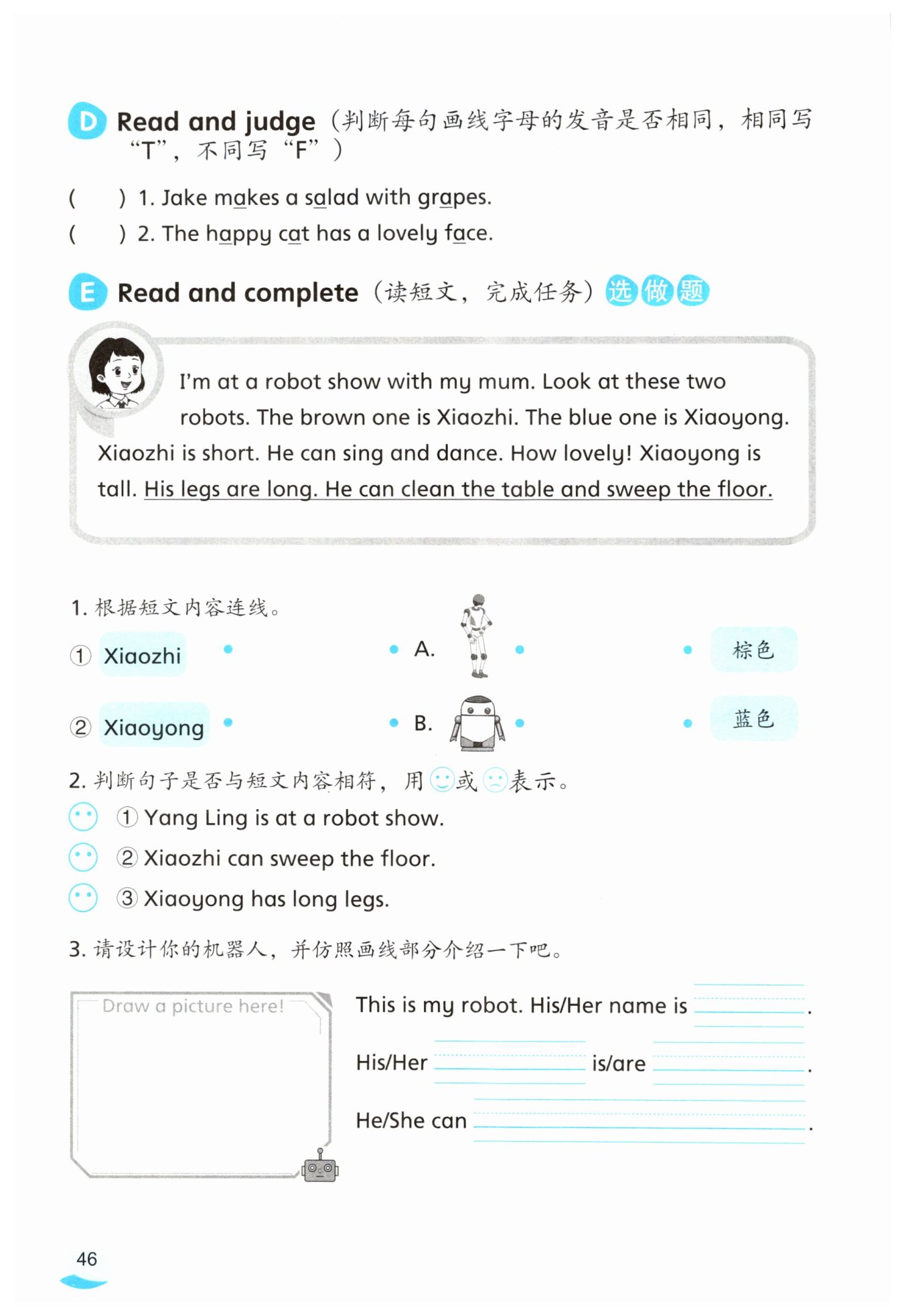 3. This is my robot. His/Her name is Xiaobai. His/Her arms are strong. He/She can lift heavy things. (答案不唯一)