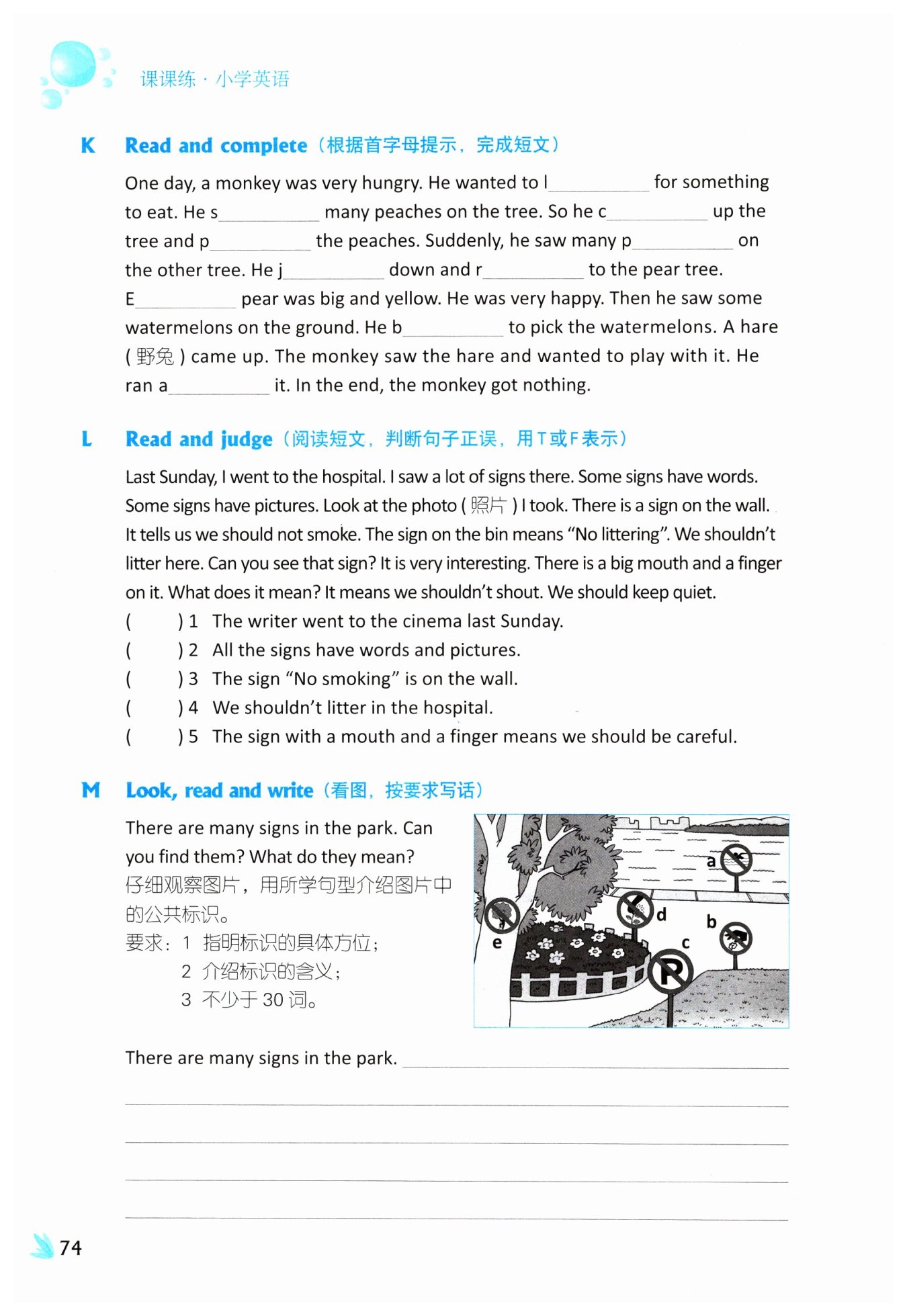 Sign "e" is on the tree; it means "No picking flowers". Sign "d" is by the flower bed; it