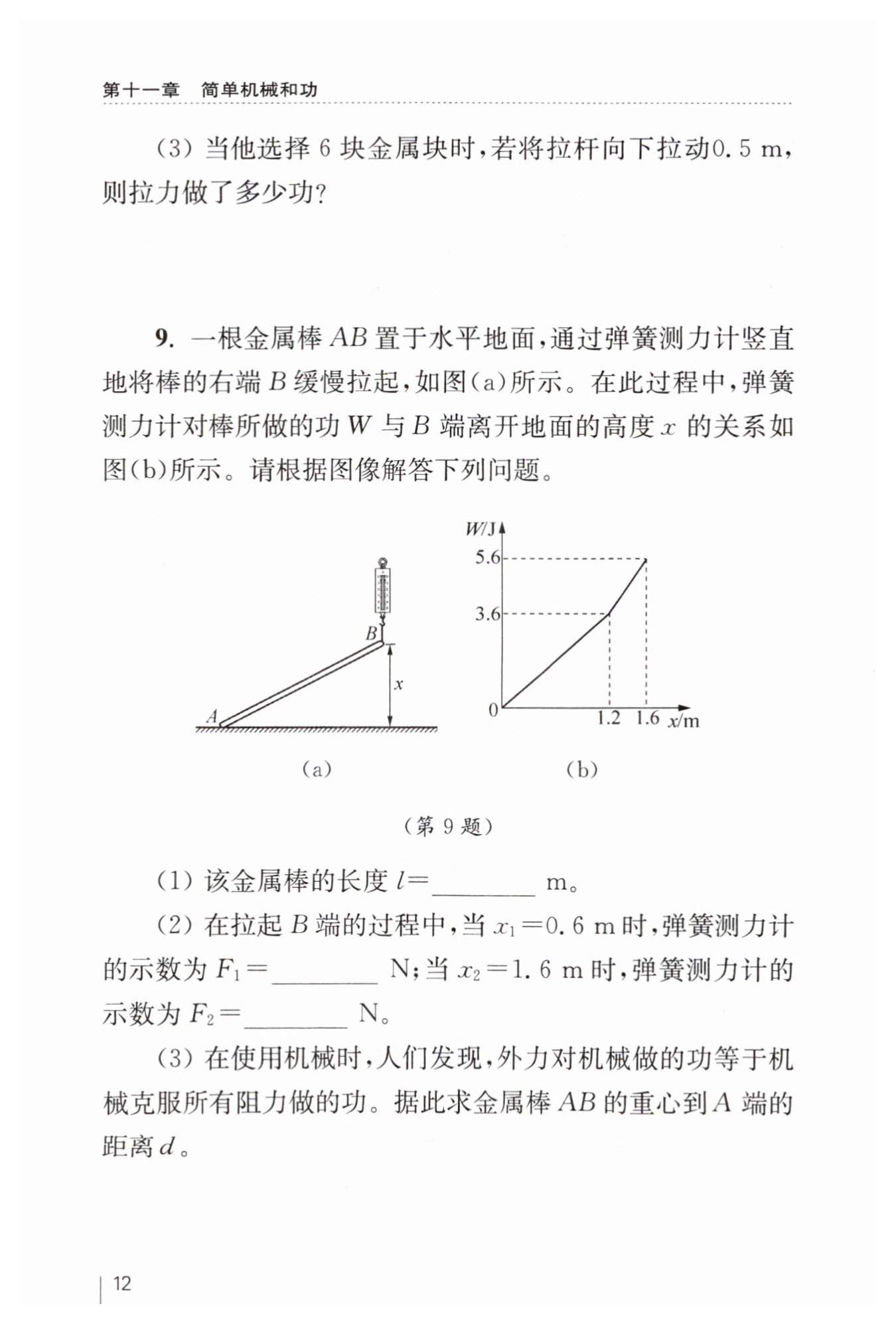 已知每塊金屬塊質(zhì)量$m_{金屬}=10kg,$選擇6塊金屬塊,總質(zhì)量$m_{總}(cāng)=6\times10kg = 60kg。$總重力$G_{總}(cāng)=m_{總}(cāng)g=60kg\times10N/kg = 600N。$因?yàn)槭褂枚ɑ啠?F = G_{總}(cāng)=600N,$拉桿移動(dòng)距離$s = 0.5m。$根據(jù)功的公式$W=Fs,$可得拉力做功$W = 600N\times0.5m=300J。$答:拉力做了$300J$的功。