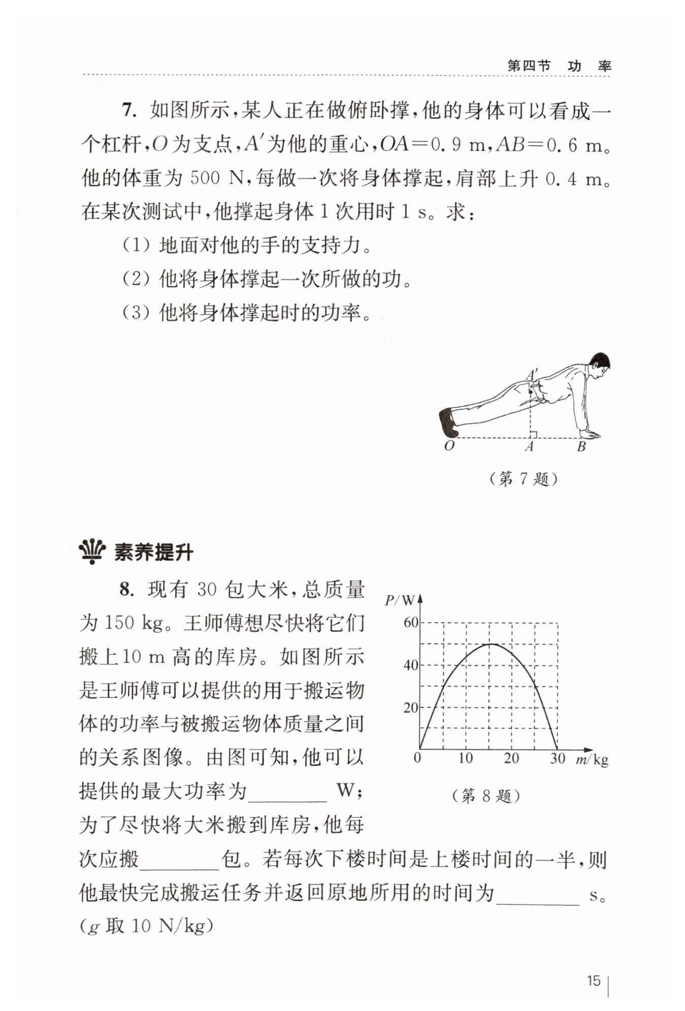 3. 每次搬運(yùn)大米重力:$G=mg=15kg×10N/kg=150N$,