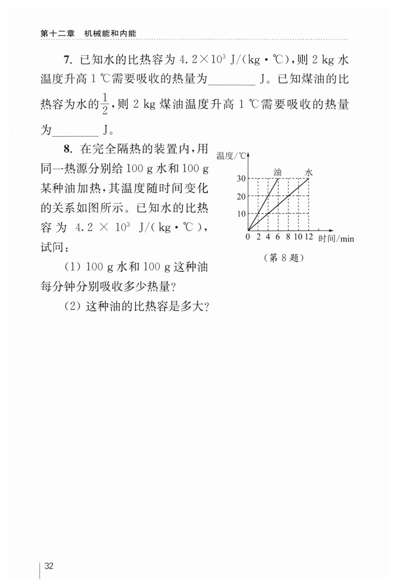 因為用同一熱源加熱,所以油每分鐘吸收的熱量與水每分鐘吸收的熱量相同,即$Q_{油每分鐘}=Q_{水每分鐘}=1050J/min$。