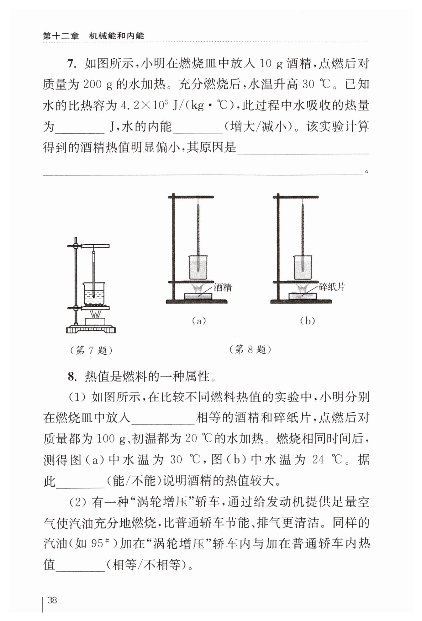(1)本題考查了比較不同燃料熱值的實(shí)驗(yàn)方法。在實(shí)驗(yàn)中,小明分別在燃燒皿中放入質(zhì)量相等的酒精和碎紙片,點(diǎn)燃后對(duì)質(zhì)量都為100g、初溫都為20°C的水加熱。燃燒相同時(shí)間后,通過(guò)測(cè)量水的溫度變化來(lái)判斷燃料的熱值大小。然而,這種方法存在一個(gè)問(wèn)題:燃燒相同時(shí)間并不意味著兩種燃料完全燃燒放出的熱量相同,因?yàn)椴煌剂系娜紵俾士赡懿煌?。因此,僅憑水溫的變化不能準(zhǔn)確判斷酒精的熱值是否較大。正確的做法應(yīng)該是比較相同質(zhì)量的酒精和碎紙片完全燃燒后,水升高的溫度或者比較加熱相同質(zhì)量的水至同一溫度所需燃料的質(zhì)量。