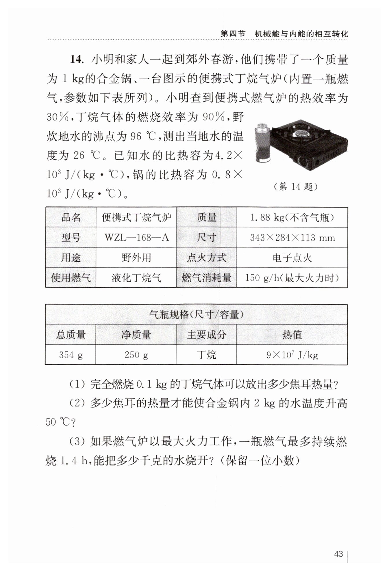 $ (3)解:燃?xì)庀馁|(zhì)量m_{氣}=150\ g/h×1.4\ h=210\ g=0.21\ kg 總熱量Q_{總}(cāng)=m_{氣}q=0.21\ kg×9×10^{7}\ J/kg=1.89×10^{7}\ J 有效熱量Q_{有}=Q_{總}(cāng)×90\%×30\%=1.89×10^{7}\ J×0.27=5.103×10^{6}\ J 鍋吸收熱量Q_{鍋}=c_{鍋}m_{鍋}\Delta t'=0.8×10^{3}J/(kg·℃)×1\ kg×70\ °C=5.6×10^{4}\ J 水吸收熱量Q_{水}'=Q_{有}-Q_{鍋}=5.103×10^{6}\ J-5.6×10^{4}\ J=5.047×10^{6}\ J 水的質(zhì)量m_{水}'=\frac{Q_{水}'}{c_{水}\Delta t'}=\frac{5.047×10^{6}\ J}{4.2×10^{3}J/(kg·℃)×70\ °C}\approx17.3\ kg $