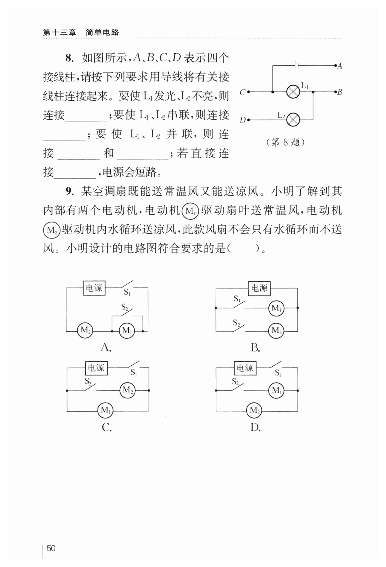 選項(xiàng)C:$M_1$和$M_2$并聯(lián),$S_1$控制干路,$S_2$與$M_2$串聯(lián)。如果$S_1$關(guān)閉,整個(gè)電路不工作;如果$S_1$打開(kāi)且$S_2$關(guān)閉,只有$M_1$工作(送常溫風(fēng));如果$S_1$和$S_2$都打開(kāi),$M_1$和$M_2$都工作(送涼風(fēng))。這符合題目要求。