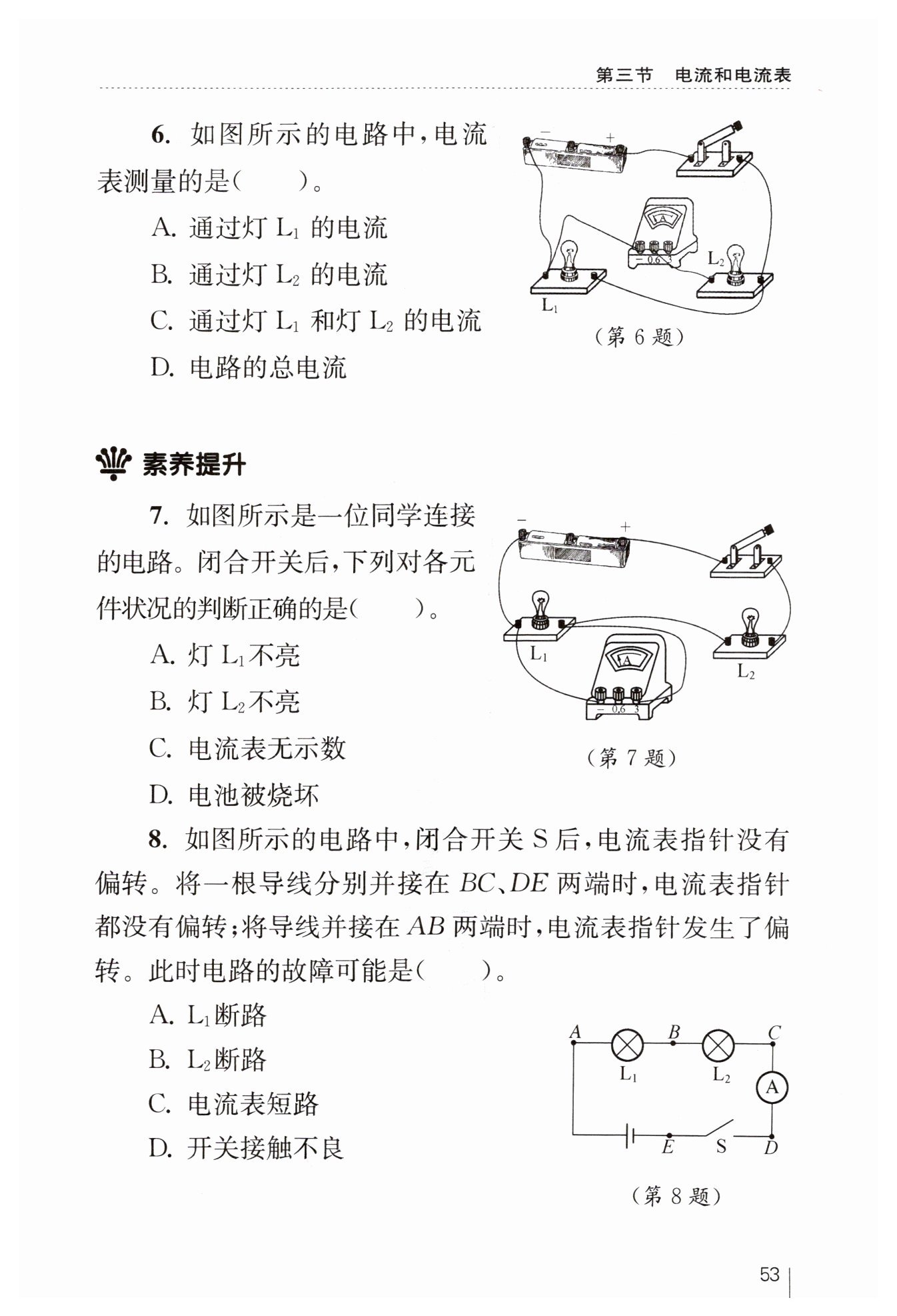 選項B:若$L_2$斷路,那么將導線連接$AB$兩端時,電路仍然是斷路,電流表不會有示數(shù),該選項錯誤。