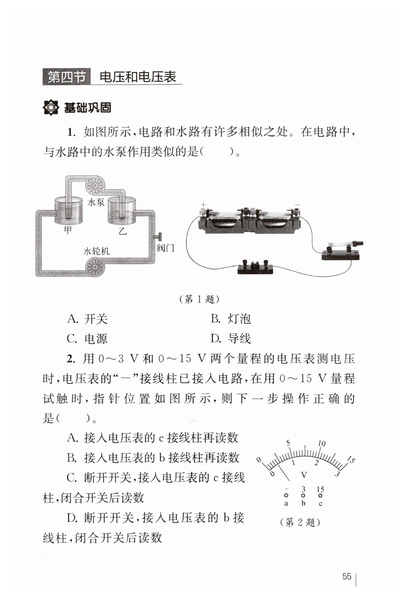 電源:電源是提供電壓的裝置,電壓是使電路中自由電荷定向移動形成電流的原因,就像水泵提供水壓使水流動一樣,電源為電路中電荷的定向移動提供動力,所以電源與水路中的水泵作用類似,C選項符合題意。