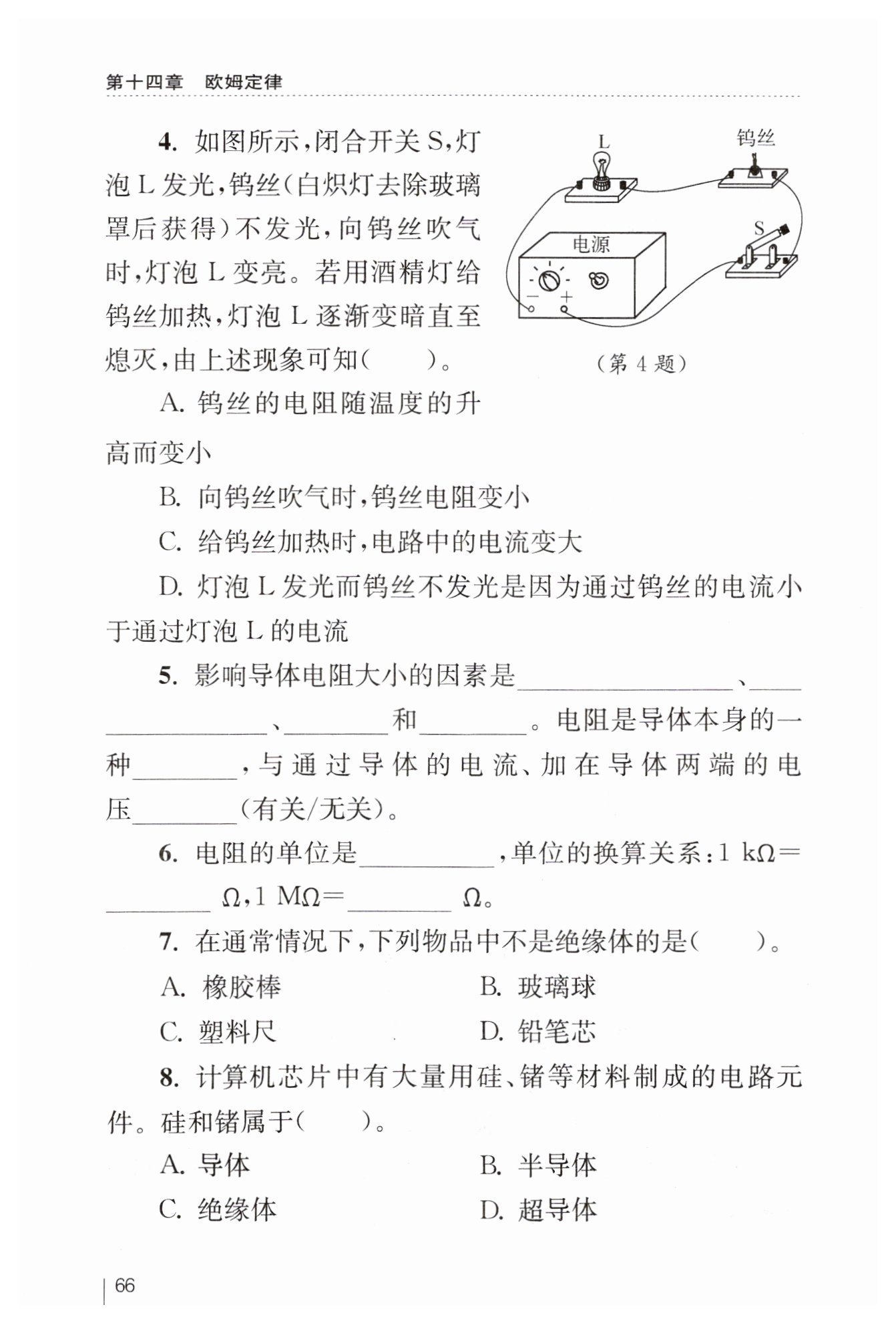 選項A:一般情況下,金屬的電阻隨溫度的升高而增大。當用酒精燈給鎢絲加熱時,鎢絲溫度升高,燈泡$L$逐漸變暗直至熄滅,說明電路中的電流變小,根據(jù)歐姆定律$I = \frac{U}{R}$(在電源電壓$U$不變的情況下,電流$I$變小,總電阻$R$變大),可知電路總電阻變大,由于燈泡電阻基本不變,所以是鎢絲的電阻變大了,即鎢絲的電阻隨溫度的升高而增大,A選項錯誤。