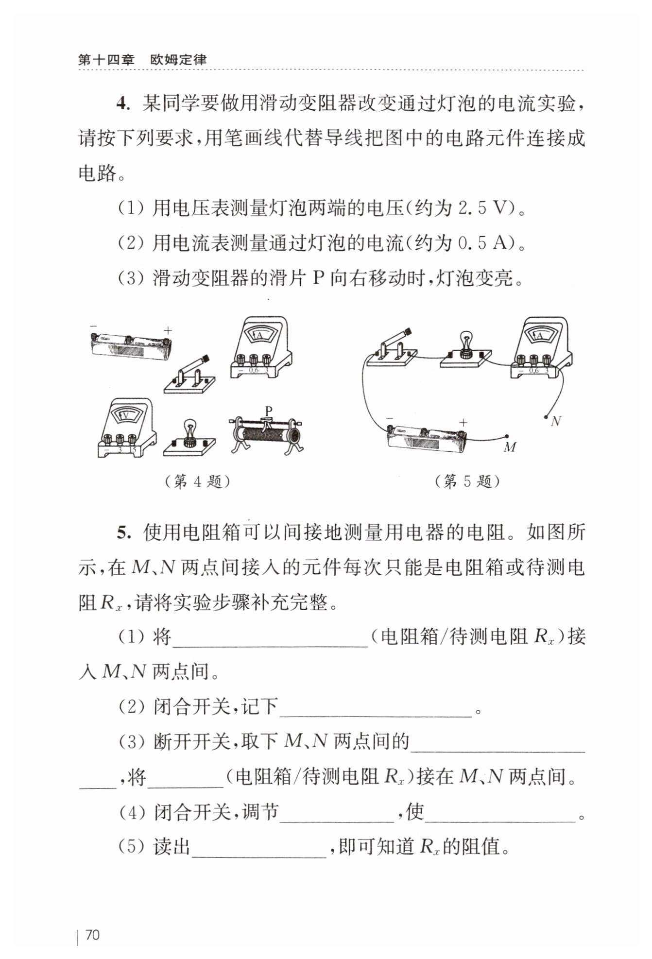 (4)閉合開關(guān),調(diào)節(jié)電阻箱的阻值,使電流表的示數(shù)仍為$I$,此時(shí)電阻箱的阻值就相當(dāng)于待測(cè)電阻$R_x$的阻值,因?yàn)樵谶@兩種情況下,電路中的其他部分(滑動(dòng)變阻器、燈泡、電源等)都沒有變化,電流相同,根據(jù)歐姆定律,總電阻相同,所以電阻箱的阻值等于待測(cè)電阻$R_x$的阻值。