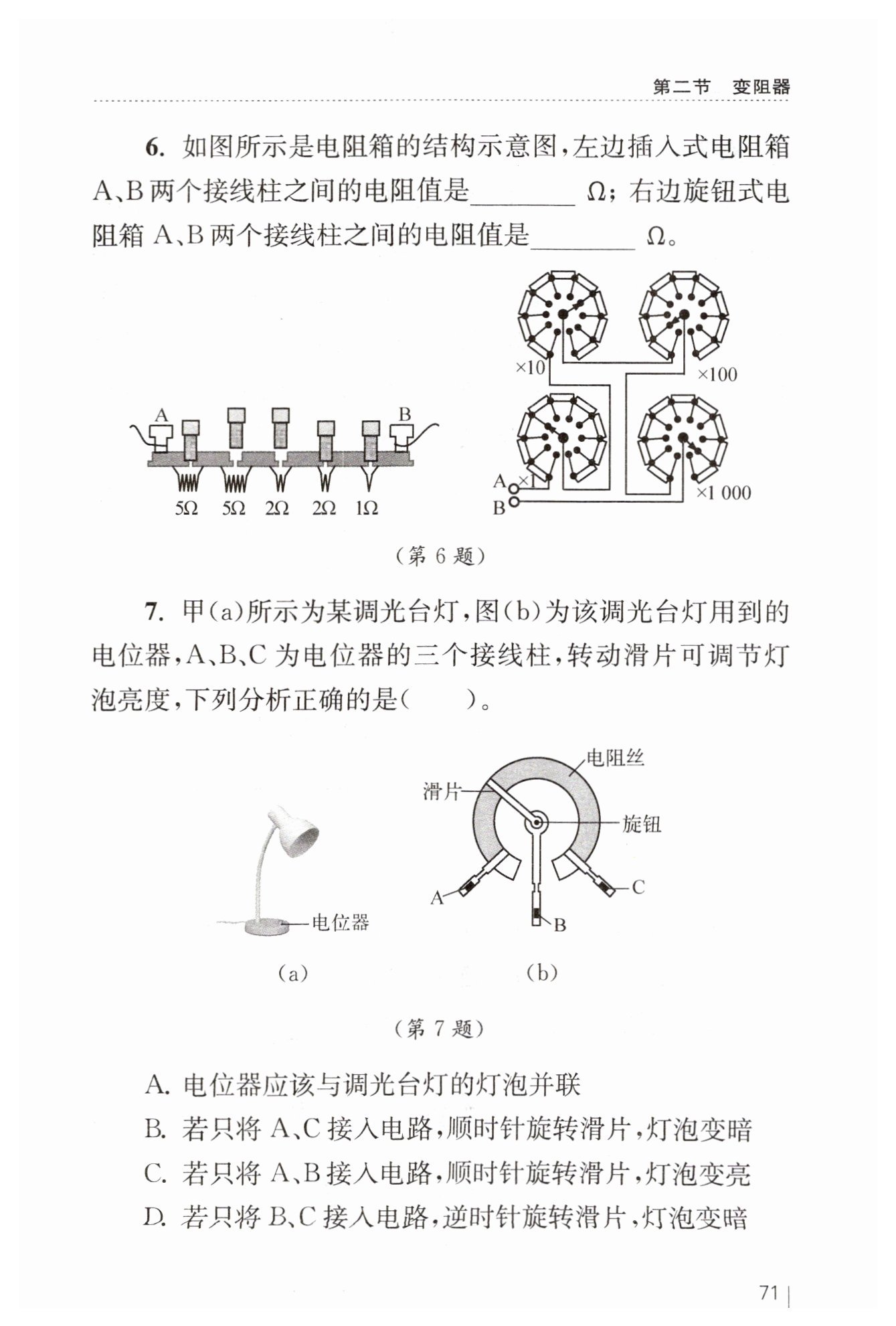 電位器是通過(guò)改變接入電路中電阻絲的長(zhǎng)度來(lái)改變電阻,從而改變電路中的電流,達(dá)到調(diào)節(jié)燈泡亮度的目的。若電位器與調(diào)光臺(tái)燈的燈泡并聯(lián),根據(jù)并聯(lián)電路各支路互不影響的特點(diǎn),電位器無(wú)法改變燈泡所在支路的電流,也就不能調(diào)節(jié)燈泡的亮度,所以電位器應(yīng)該與調(diào)光臺(tái)燈的燈泡串聯(lián),A選項(xiàng)錯(cuò)誤。