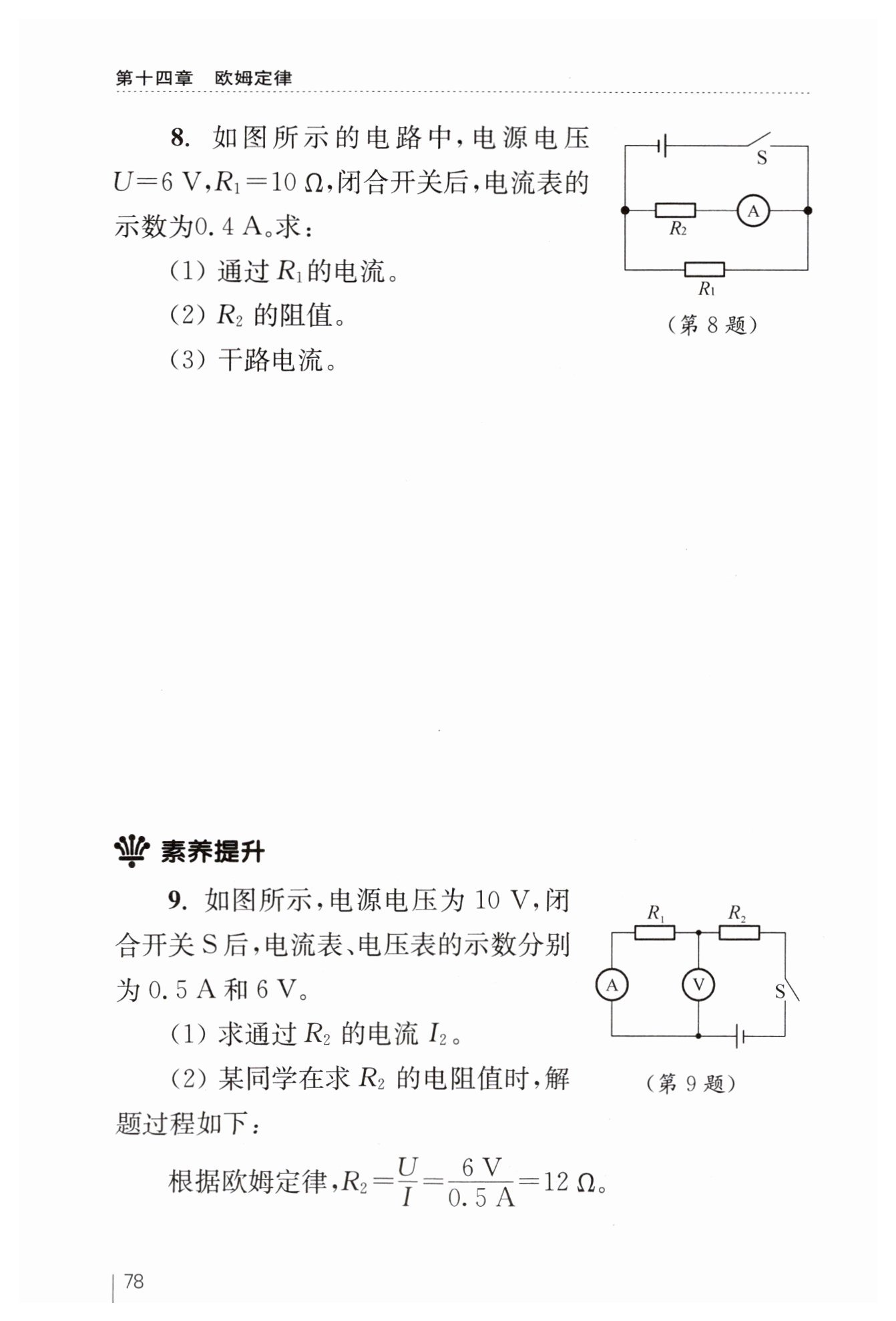(2)已知電流表的示數(shù)為通過(guò)$R_2$的電流$I_2 = 0.4\,\text{A},$$R_2$兩端的電壓$U_2 = U = 6\,\text{V},$由歐姆定律可得$R_2$的阻值$R_2=\frac{U_2}{I_2}=\frac{6\,\text{V}}{0.4\,\text{A}}=15\,\Omega。$