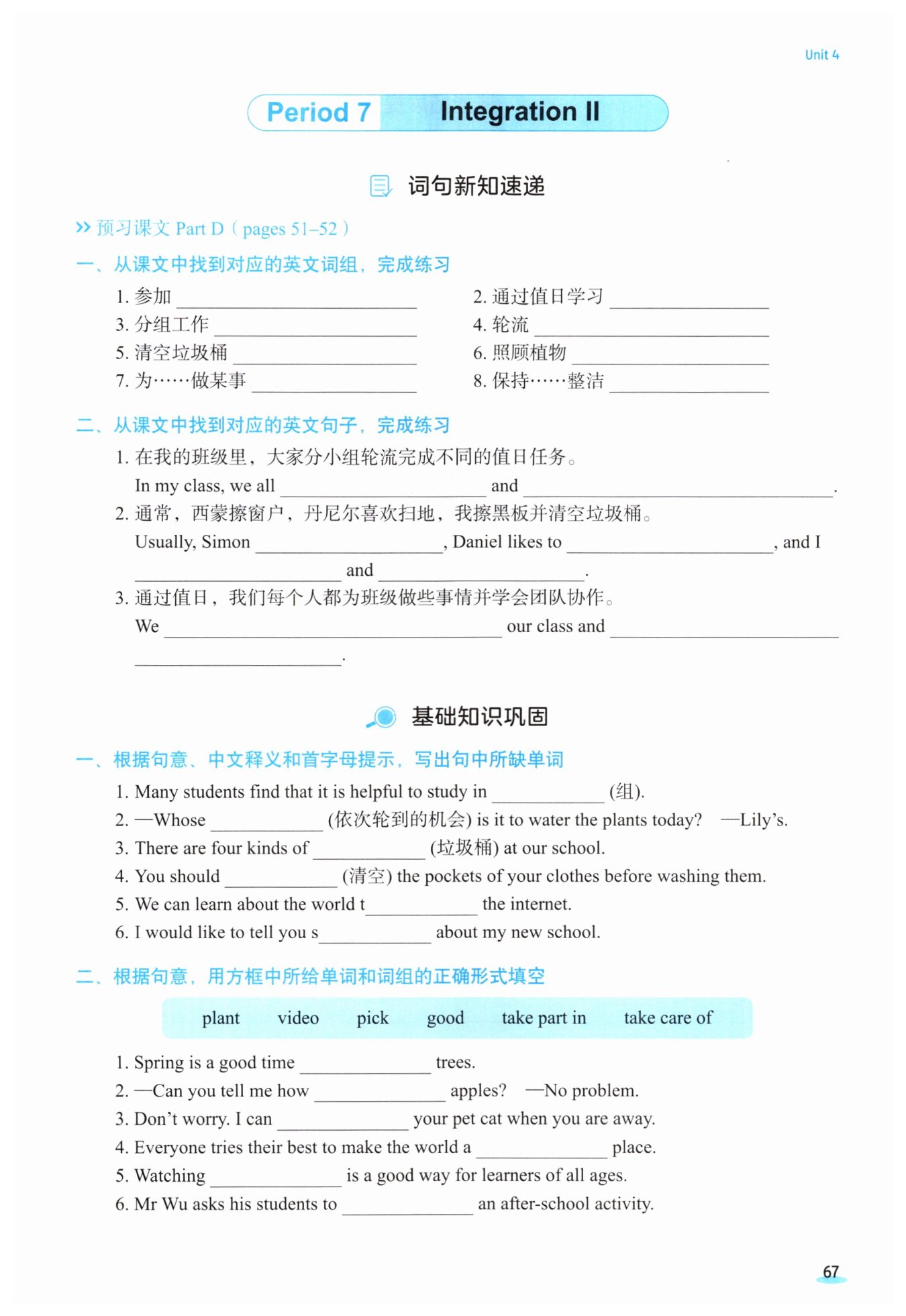 這道題是英語七年級(jí)的填空題,主要考查詞匯和短語的正確形式填空,需要根據(jù)句意選擇方框中給出的單詞或詞組,并填入適當(dāng)?shù)男问健?br>1. 第一空考查的是“plant trees”這一短語,表示“種樹”。在“Spring is a good time ______ trees.”中,根據(jù)句意應(yīng)填“to plant”,表示春天是種樹的好時(shí)機(jī)。