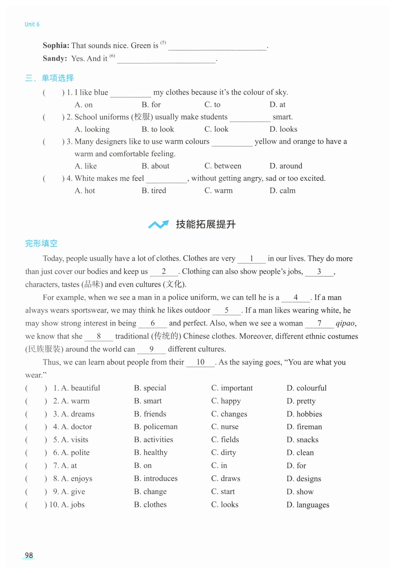 【解析】:這是一道英語選擇題,考查的是介詞在語境中的正確使用。題目中的句子是"I like blue ______ my clothes because it's the colour of sky.",意思是“我喜歡藍(lán)色______我的衣服,因?yàn)樗翘炜盏念伾?。”。這里需要選擇一個合適的介詞來填空。