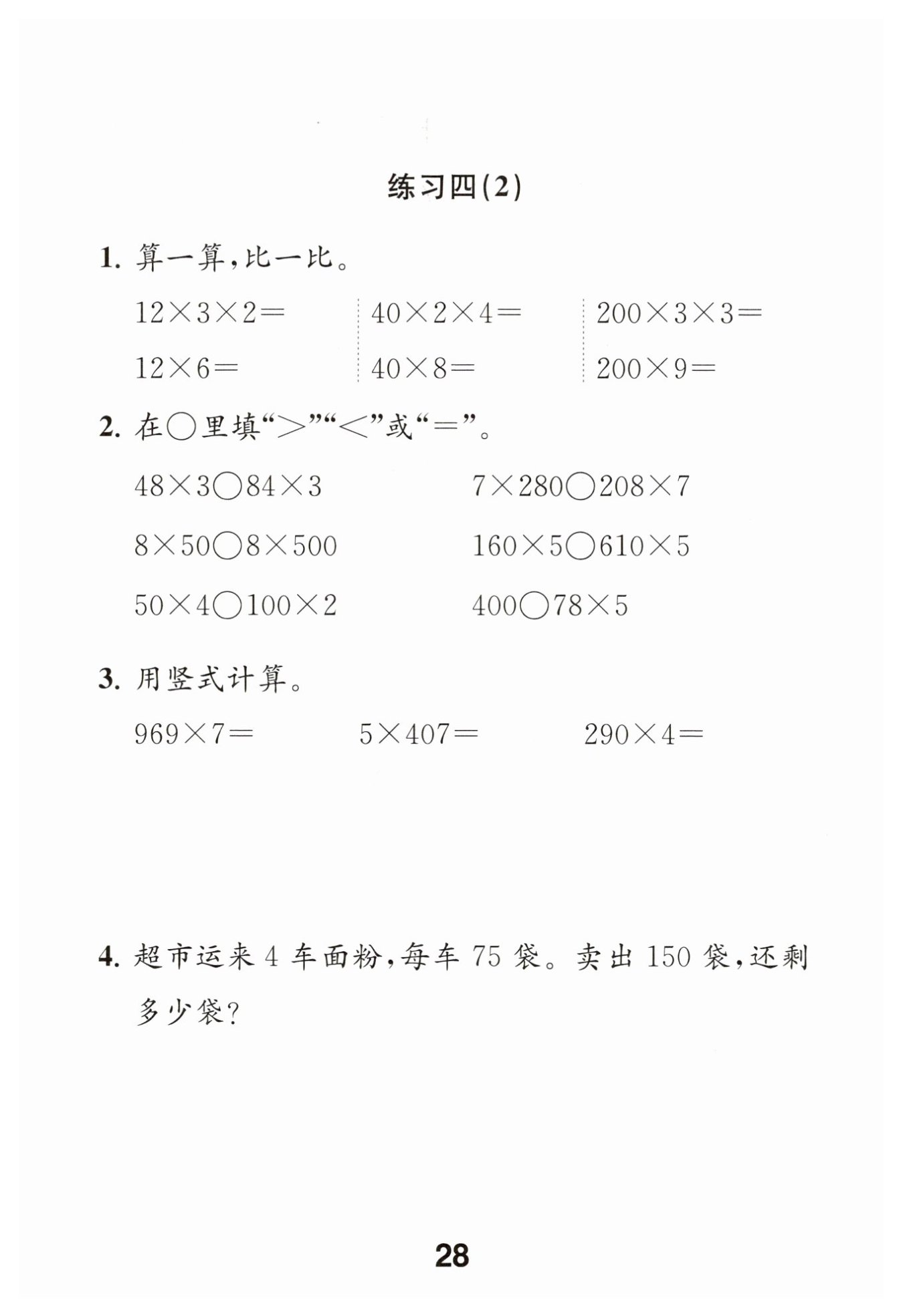 首先計算超市一共運(yùn)來的面粉袋數(shù),每車75袋,共4車,所以運(yùn)來的面粉袋數(shù)為$75\times4 = 300$袋。