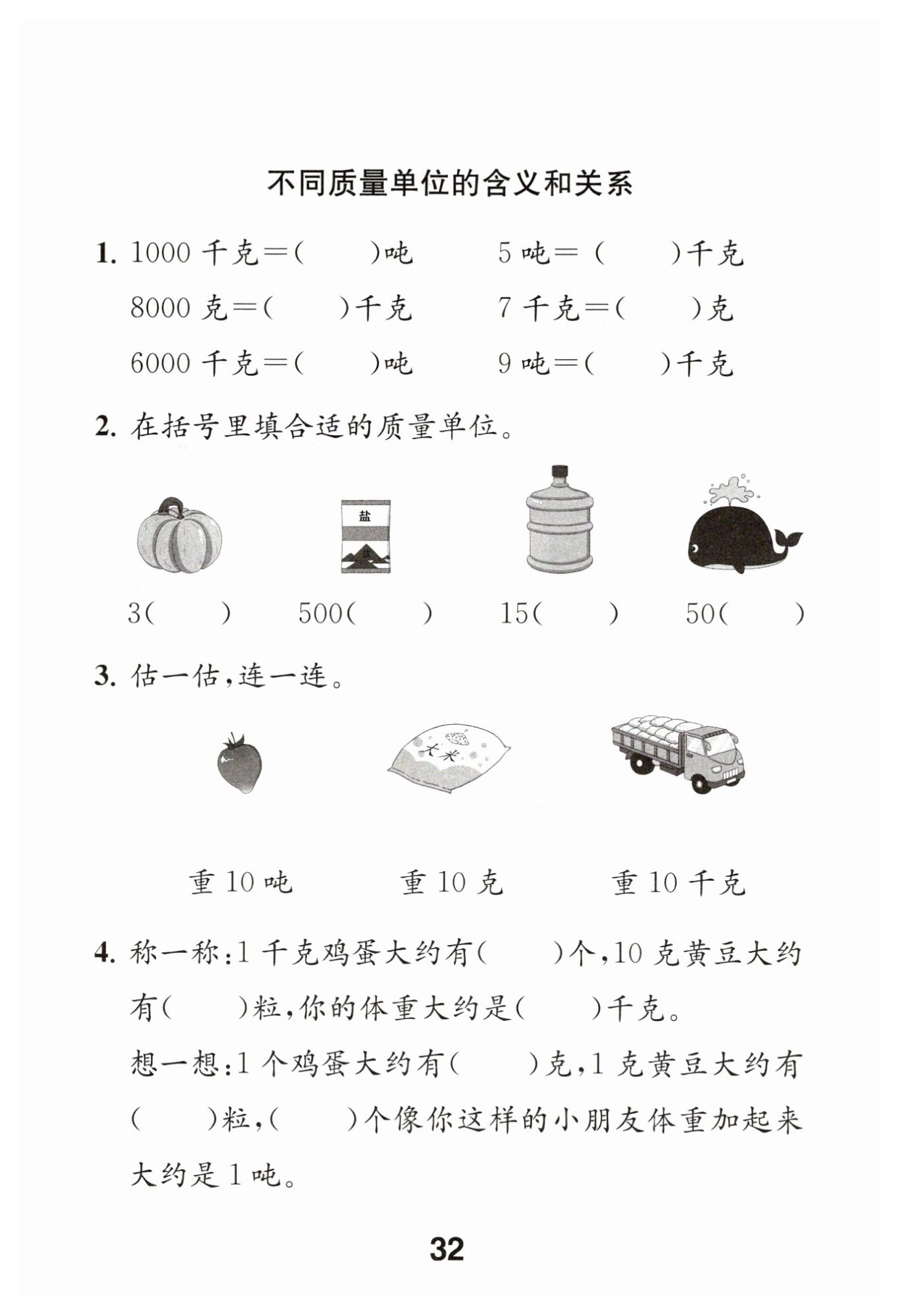 結(jié)合生活實(shí)際,一顆草莓的質(zhì)量較輕,大約$10$克;一袋大米的質(zhì)量較重,大約$10$千克;一輛卡車(chē)裝載的貨物很多,質(zhì)量很大,大約$10$噸。