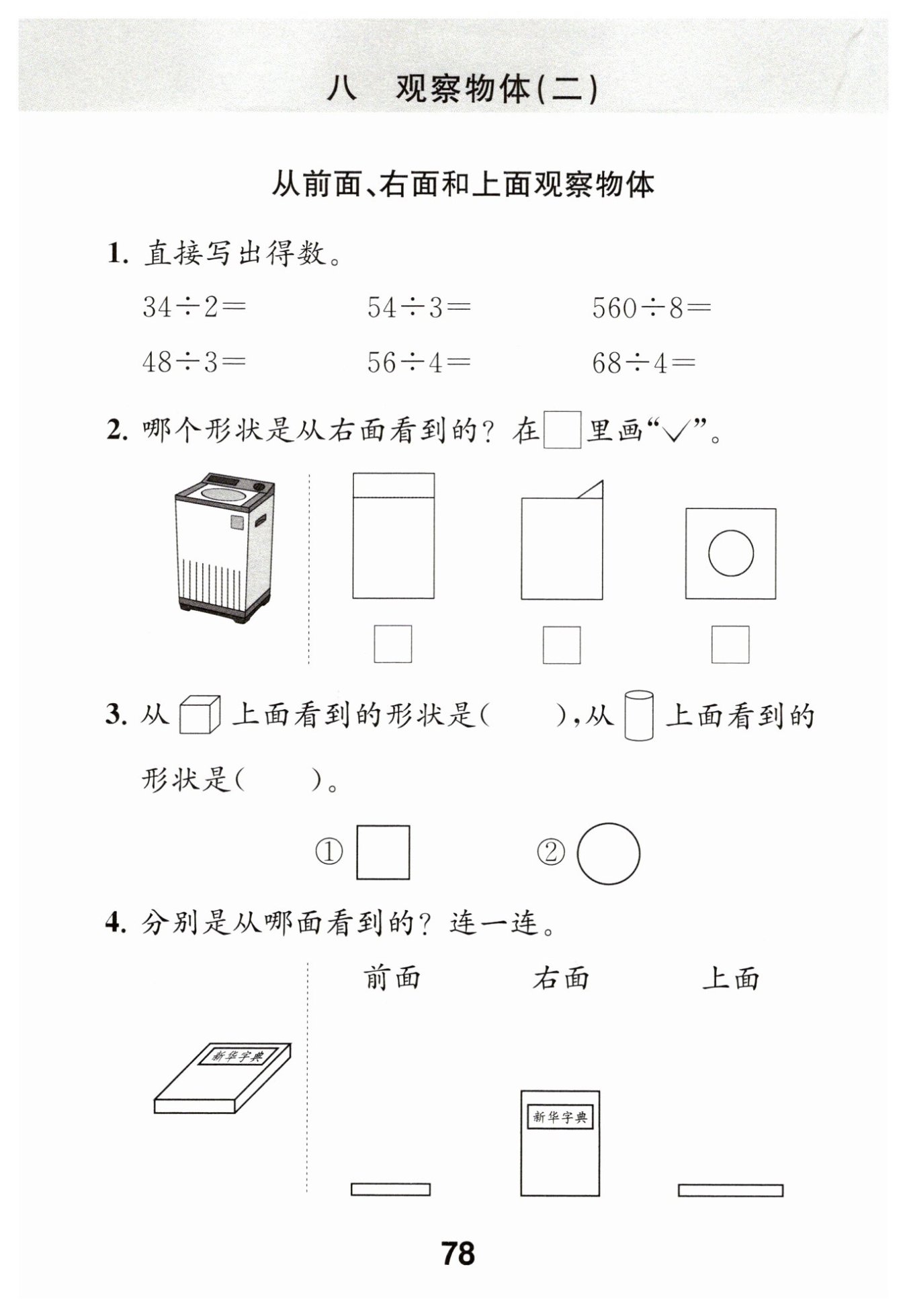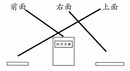 解析:本題考查從不同方向觀察物體。從前面看,看到的是長方體的側(cè)面,書名在左側(cè),即第二幅圖;從右面看,看到的也是長方體的側(cè)面,書名在右側(cè),即第三幅圖;從上面看,看到的是長方體的上面,即第一幅圖。