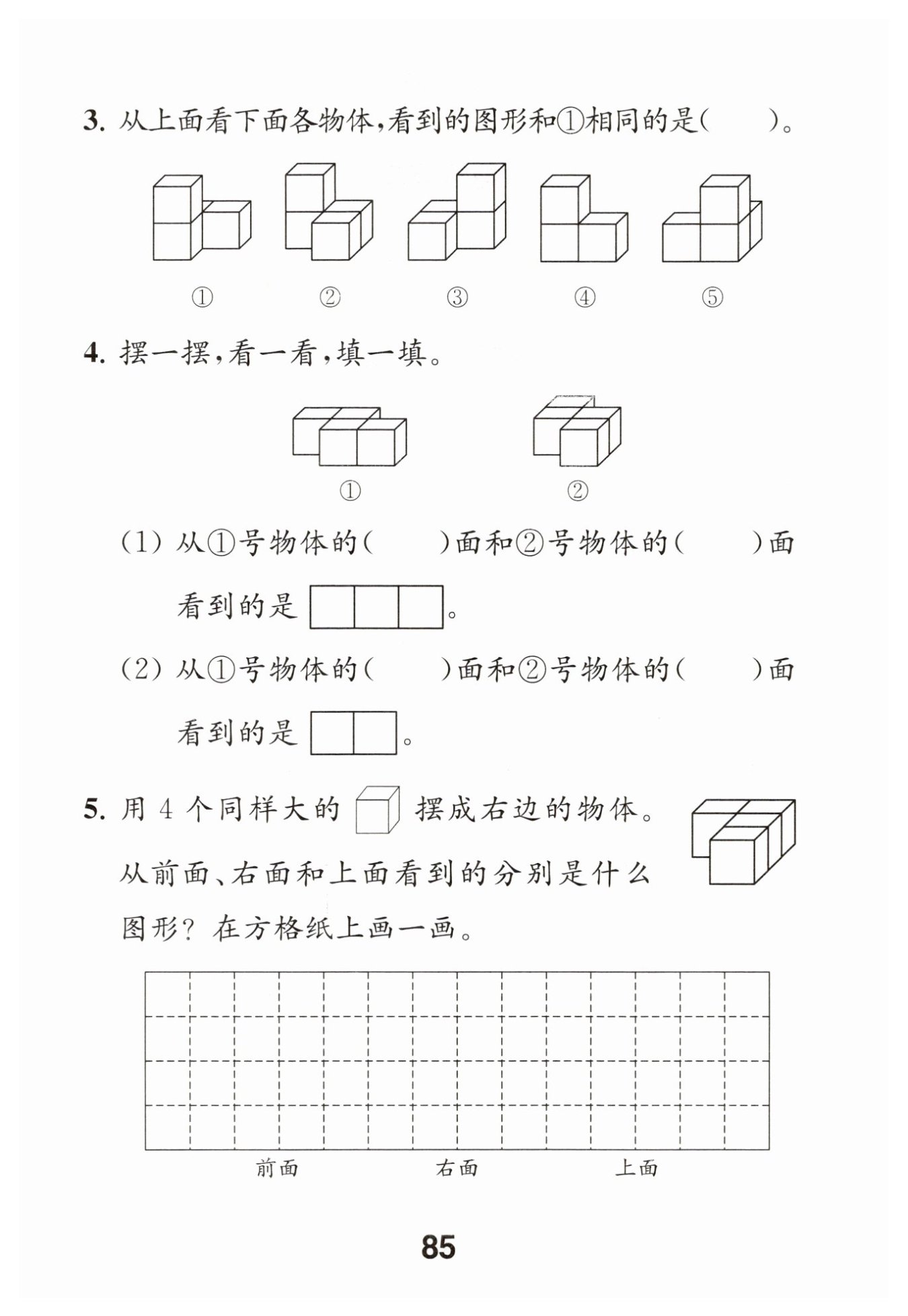 解析:本題考查了從不同方向觀察幾何體以及三視圖的知識(shí)點(diǎn)。通過(guò)觀察由4個(gè)同樣大的正方體擺成的物體,確定從前面、右面和上面看到的圖形形狀,考查學(xué)生的空間想象能力和對(duì)三視圖的理解。