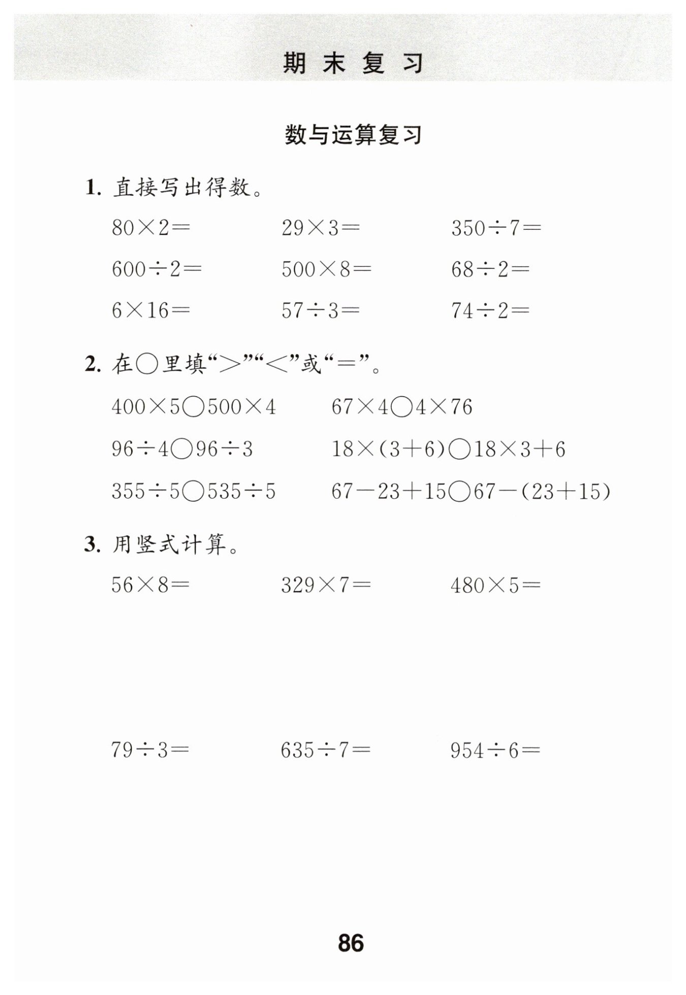 這些題目考查的是基礎(chǔ)的乘法和除法豎式計(jì)算。乘法可以直接按位相乘然后相加,除法需要注意除不盡的情況以及余數(shù)的處理。