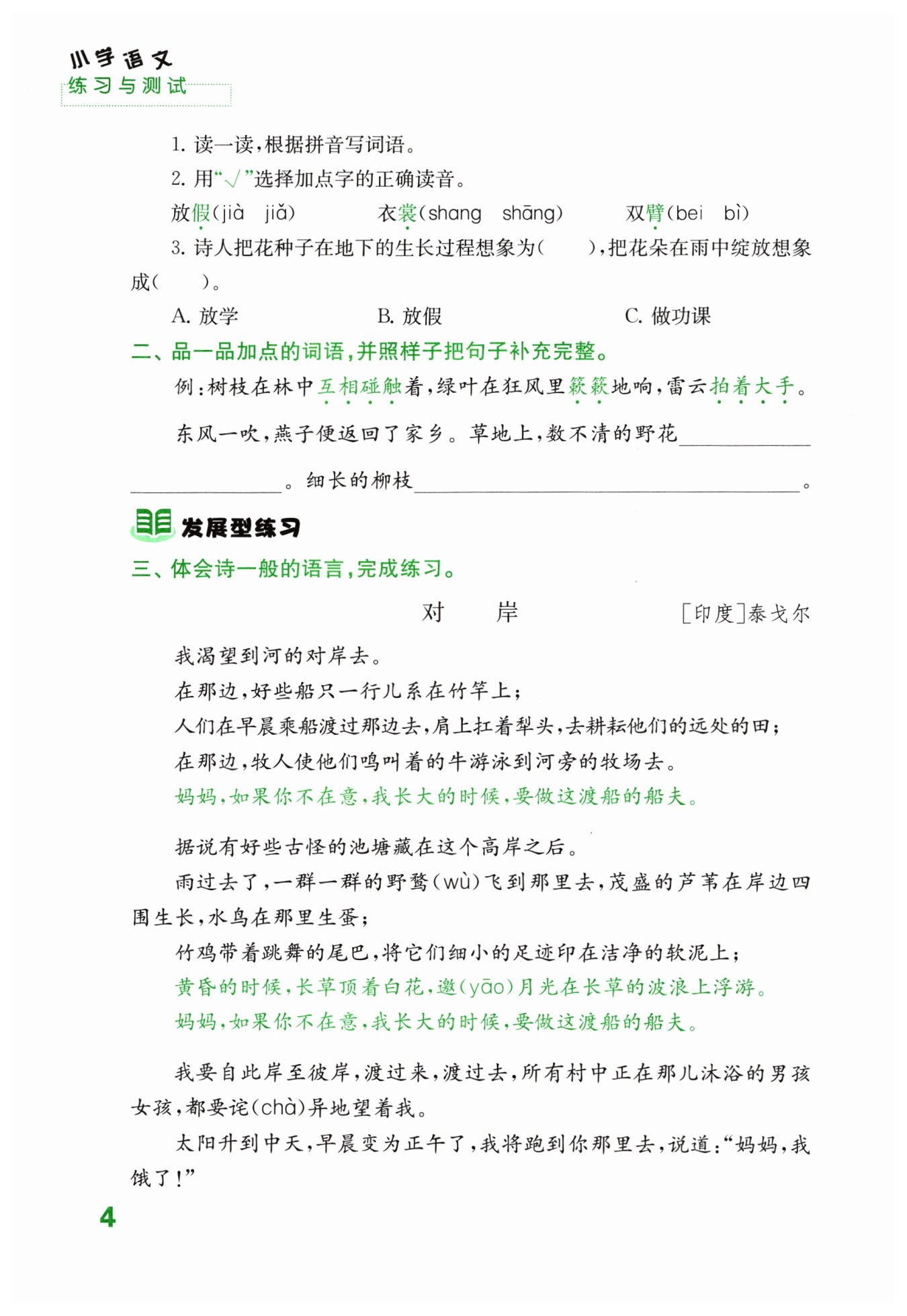 解析:第一部分描述了人們?cè)诤訉?duì)岸的耕耘和放牧活動(dòng),對(duì)應(yīng)選項(xiàng)C;第二部分描述了對(duì)岸的動(dòng)植物自由活動(dòng)生長(zhǎng)的情景,對(duì)應(yīng)選項(xiàng)A;第三部分則表達(dá)了孩子渴望成為船夫,往返于兩岸之間的愿望,對(duì)應(yīng)選項(xiàng)B。