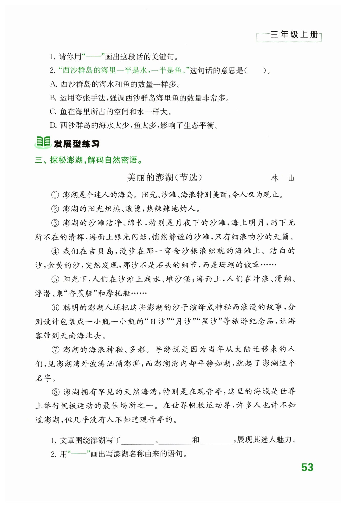 1. 文章圍繞澎湖寫了陽光、沙灘和海浪,展現(xiàn)其迷人魅力。