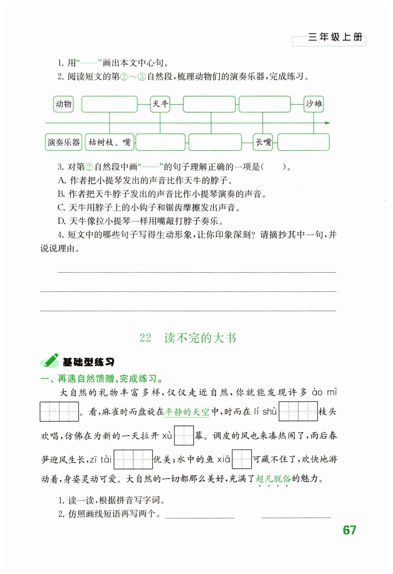 扣,活像羊羔在森林的上空叫! 理由:這句話生動(dòng)地描寫(xiě)了沙雉用尾巴唱歌的奇特方式和聲音,“異想天開(kāi)”一詞讓沙雉的形象更加有趣,“活像羊羔”的比喻也很形象。