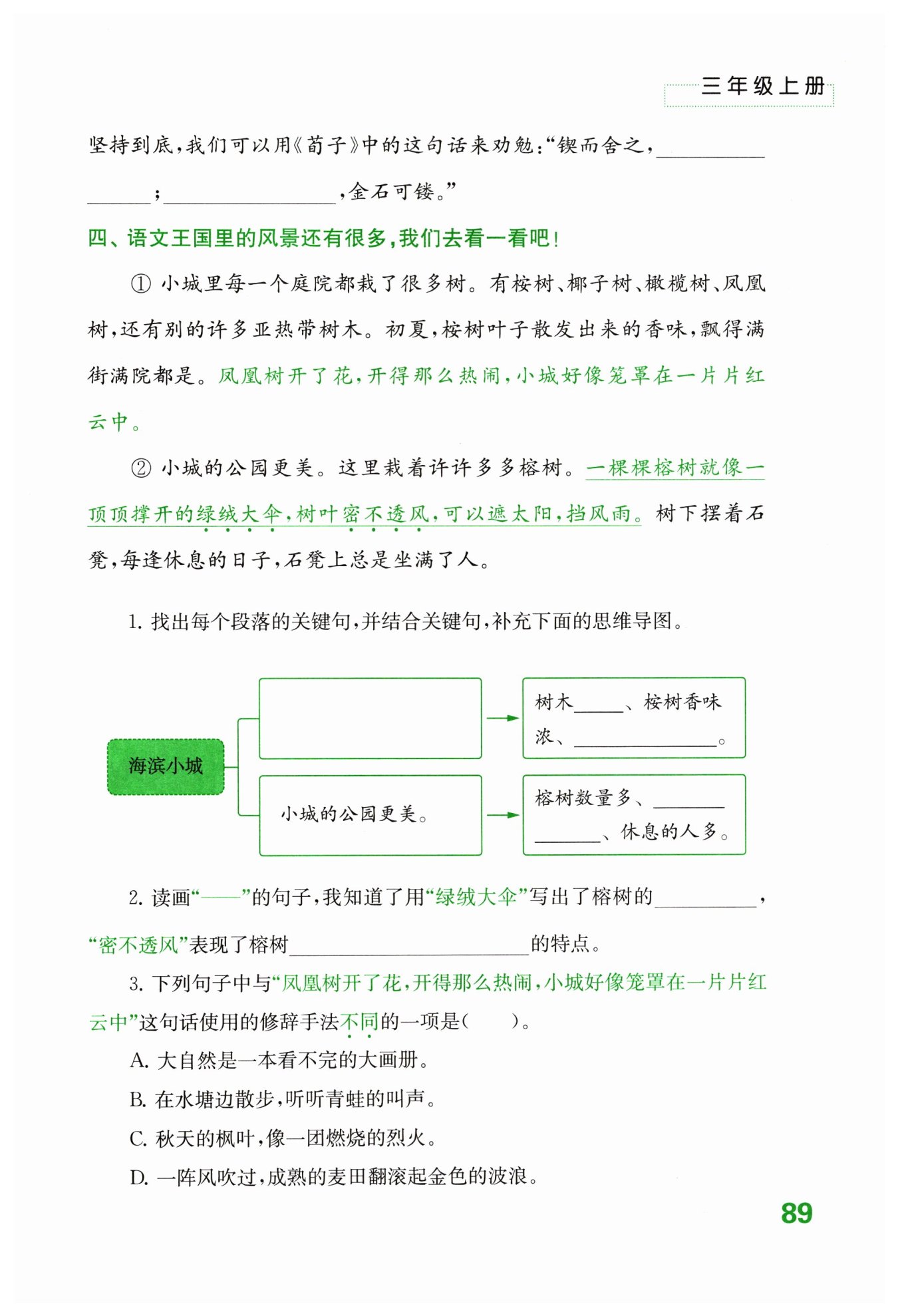 1. 小城里每一個庭院都栽了很多樹。;種類多;鳳凰樹花開得熱鬧;形狀像綠絨大傘