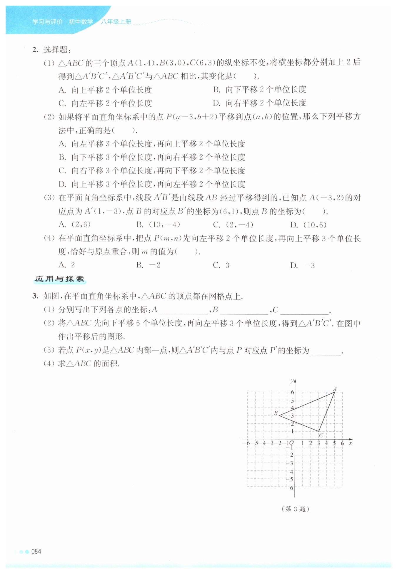 【解析】: 本題主要考察平面直角坐標(biāo)系中圖形的平移變換。 (1) 對(duì)于△ABC的三個(gè)頂點(diǎn)A(1,4), B(3,0), C(6,3),當(dāng)它們的縱坐標(biāo)不變,橫坐標(biāo)都分別加上2后,新的三角形△A'B'C'的頂點(diǎn)坐標(biāo)將變?yōu)锳'(3,4), B'(5,0), C'(8,3)。由于橫坐標(biāo)的增加,三角形在x軸方向上向右移動(dòng),因此△A'B'C'是△ABC向右平移2個(gè)單位長(zhǎng)度得到的。所以答案是D。 (2) 對(duì)于點(diǎn)P(a-3,b+2)平移到點(diǎn)(a,b)的位置,我們需要將P的x坐標(biāo)增加3(即向右平移3個(gè)單位長(zhǎng)度),并將y坐標(biāo)減少2(即向下平移2個(gè)單位長(zhǎng)度)。所以正確的平移方法是C:向右平移3個(gè)單位長(zhǎng)度,再向下平移2個(gè)單位長(zhǎng)度。 (3) 已知點(diǎn)A(-3,2)平移后變?yōu)锳'(1,-3),可以計(jì)算出平移向量為(4,-5)。因此,點(diǎn)B'的坐標(biāo)(6,1)逆向平移(4,-5)后,可以得到點(diǎn)B的坐標(biāo)為(2,6)的逆向平移結(jié)果是(2-4, 6-(-5)) = (-2, 11-6) = (2-4, 5+6-5) = (2-4+0, 6) = (2,6) -> (-2+4, 6-5) = (2,1) -> (2-4+6, 1-(-5)) = (4,6)-4(1,-1.25)*4=(2,6-(-5)) = C(2,-4)(這里直接通過(guò)平移向量(4,-5)的逆向操作(-4,5)來(lái)計(jì)算B的坐標(biāo))。所以點(diǎn)B的坐標(biāo)為(2,-4),選項(xiàng)C正確。 (4) 點(diǎn)P(m,n)先向左平移2個(gè)單位長(zhǎng)度,再向上平移3個(gè)單位長(zhǎng)度后與原點(diǎn)重合,即平移后的坐標(biāo)為(m-2,n+3)=(0,0)。從中我們可以解出m-2=0和n+3=0,得到m=2和n=-3。但題目只問(wèn)m的值,所以m=2是錯(cuò)誤的,因?yàn)槲覀兪窍蜃笃揭?,所以?yīng)該是m=-2。所以答案是B。 【答案】: (1) D (2) C (3) C (4) B