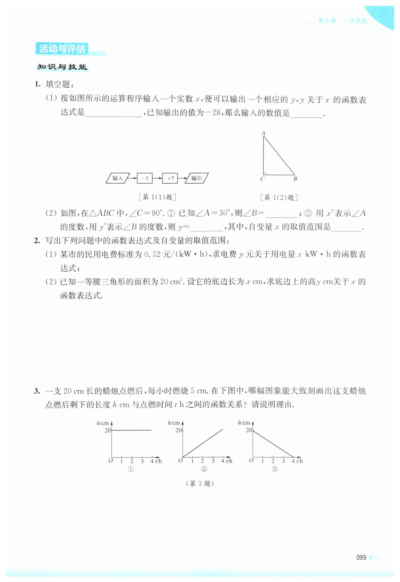 【答案】:圖③。理由:蠟燭剩余長度$h$與點燃時間$t$之間的函數(shù)關(guān)系為$h = 20 - 5t(0\leq t\leq4)$,$h$隨$t$的增大而減小,當(dāng)$t = 0$時,$h = 20$,當(dāng)$t = 4$時,$h = 0$,圖③符合這一關(guān)系。