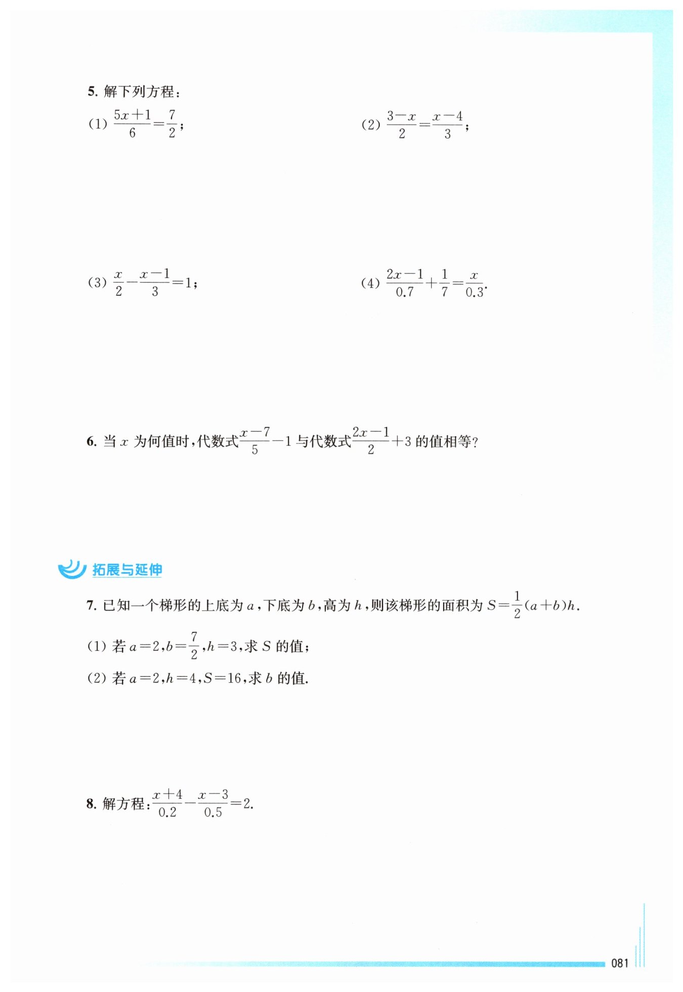 解:根據題意,得?$\frac {x - 7}{5} - 1 = \frac {2x - 1}{2} + 3$?