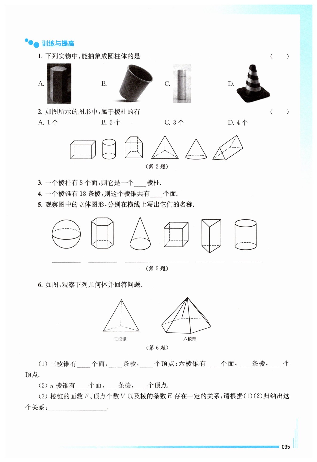 第六個圖形是三棱柱,上下底面平行且全等,側(cè)面為平行四邊形,符合棱柱的特征。