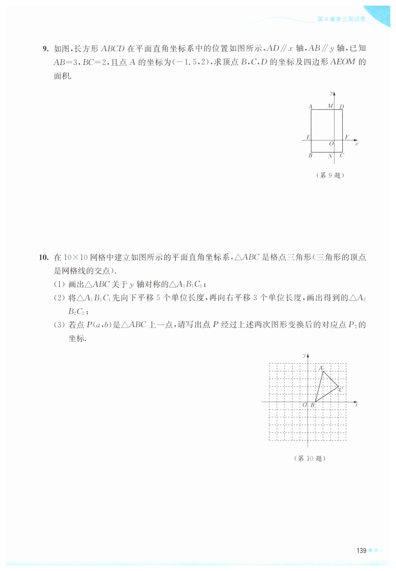 (3)對于點$P(a,b)$,先關(guān)于$y$軸對稱,得到點$P_1(-a,b)$,再向下平移$5$個單位長度,縱坐標(biāo)變?yōu)?b-5$,再向右平移$3$個單位長度,橫坐標(biāo)變?yōu)?-a+3$,所以$P_2$的坐標(biāo)為$(-a+3,b-5)$。