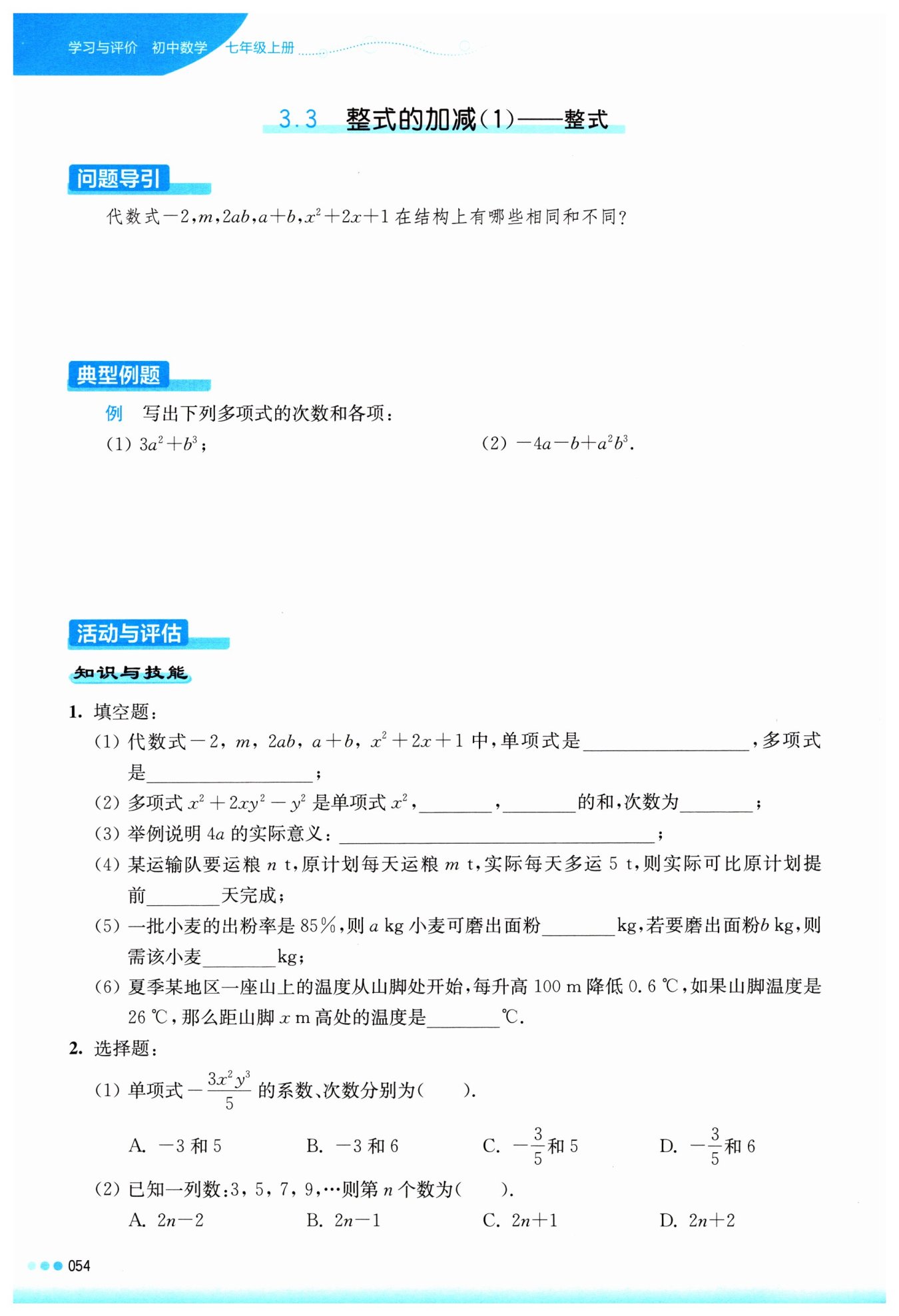 (1) 單項(xiàng)式是只含有一個(gè)項(xiàng)的代數(shù)式,所以$-2, m, 2ab$是單項(xiàng)式;多項(xiàng)式是由有限個(gè)單項(xiàng)式相加或相減構(gòu)成的代數(shù)式,所以$a+b, x^{2}+2x+1$是多項(xiàng)式。