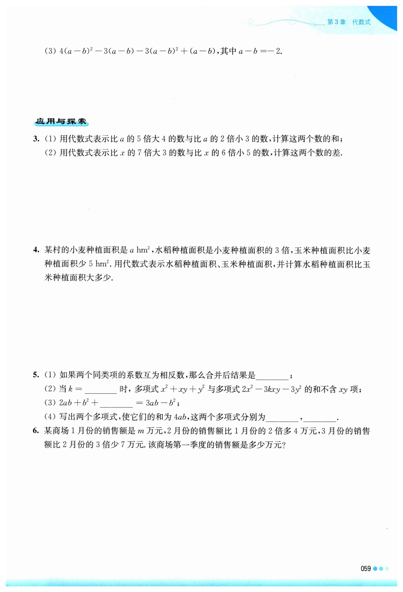 (3) 設(shè)空缺項(xiàng)為$X$,則$2ab + b^2 + X = 3ab - b^2$,解得$X = ab - 2b^2$。