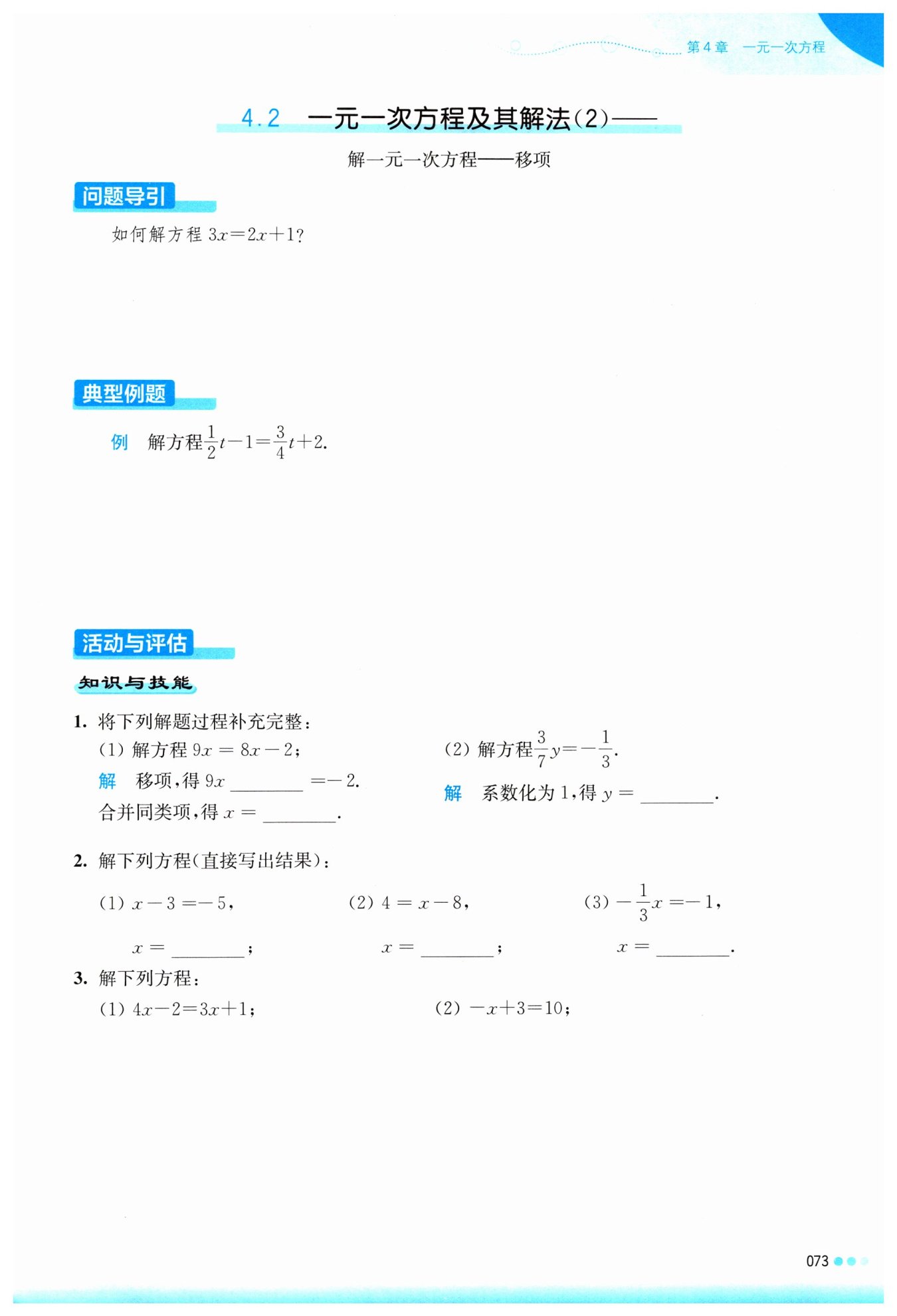 (3) 對于方程 $-\frac{1}{3}x = -1$,根據等式性質,兩邊同時乘以-3,得 $x = (-1) × (-3)$,解得 $x = 3$。