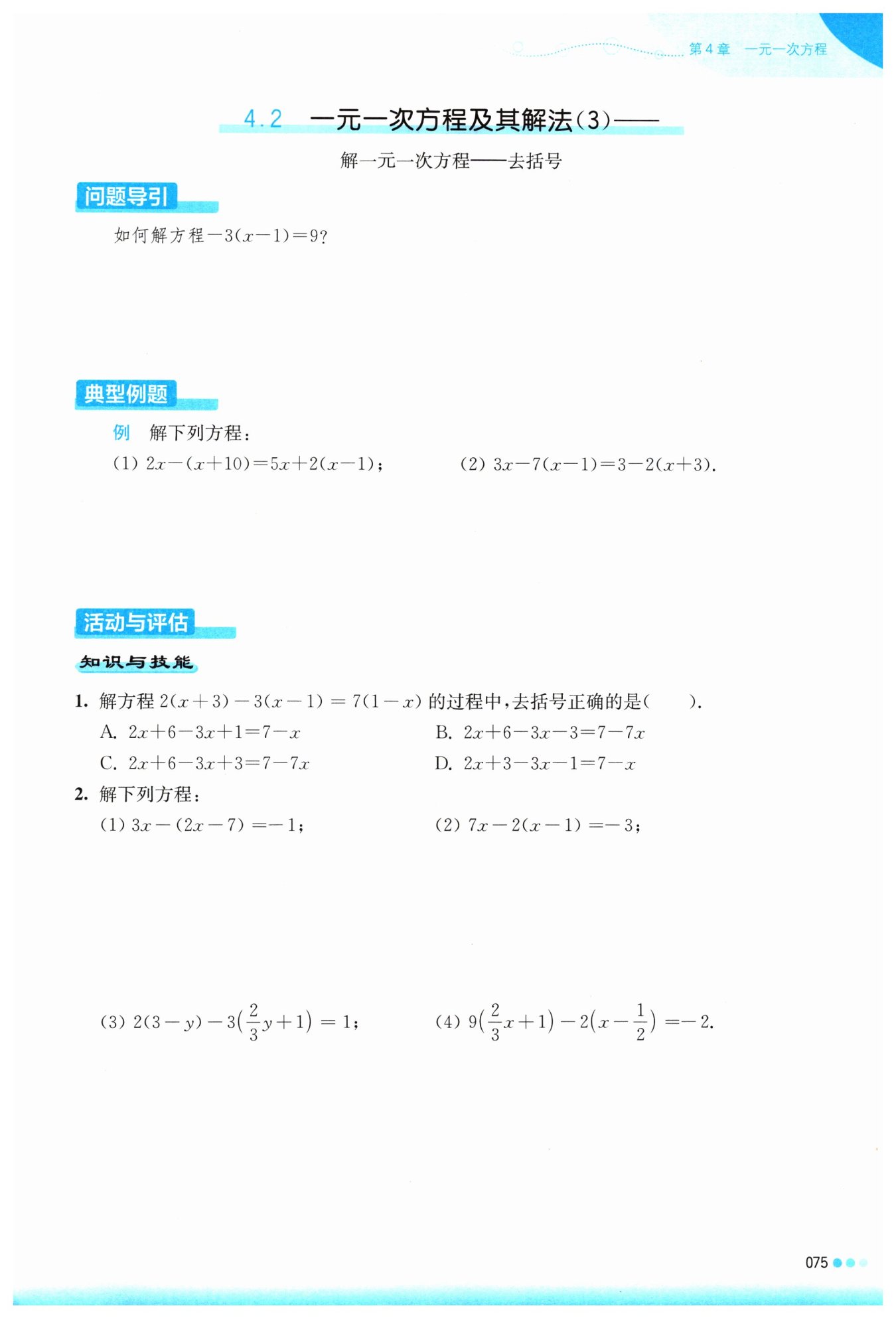 解:$3x - 7(x - 1) = 3 - 2(x + 3)$