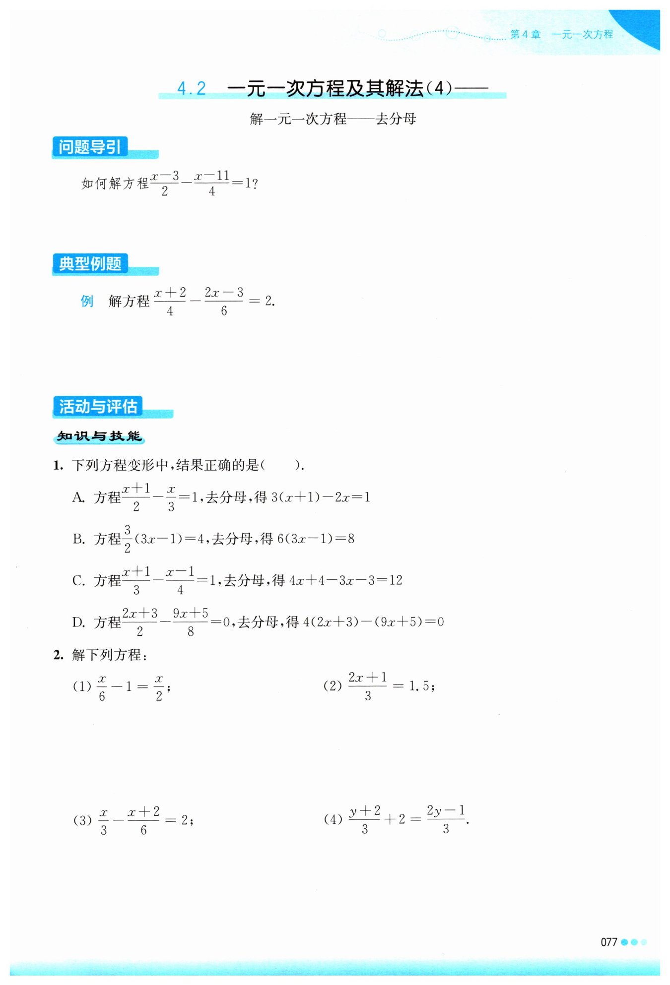 兩邊同乘4去分母,得$2(x - 3)-(x - 11)=4$