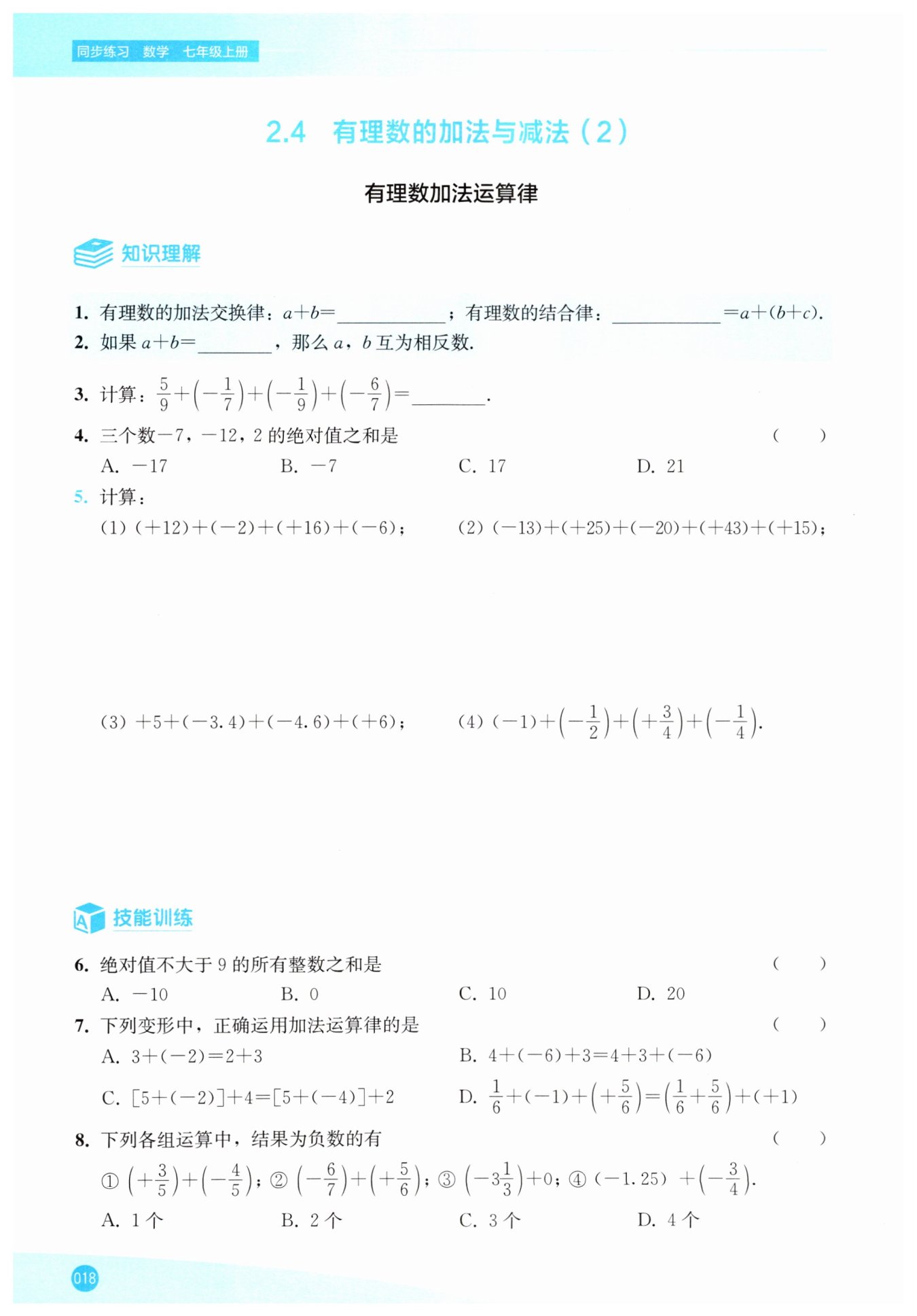③$(-3\frac{1}{3})+0=-3\frac{1}{3}$,結(jié)果為負(fù)數(shù);