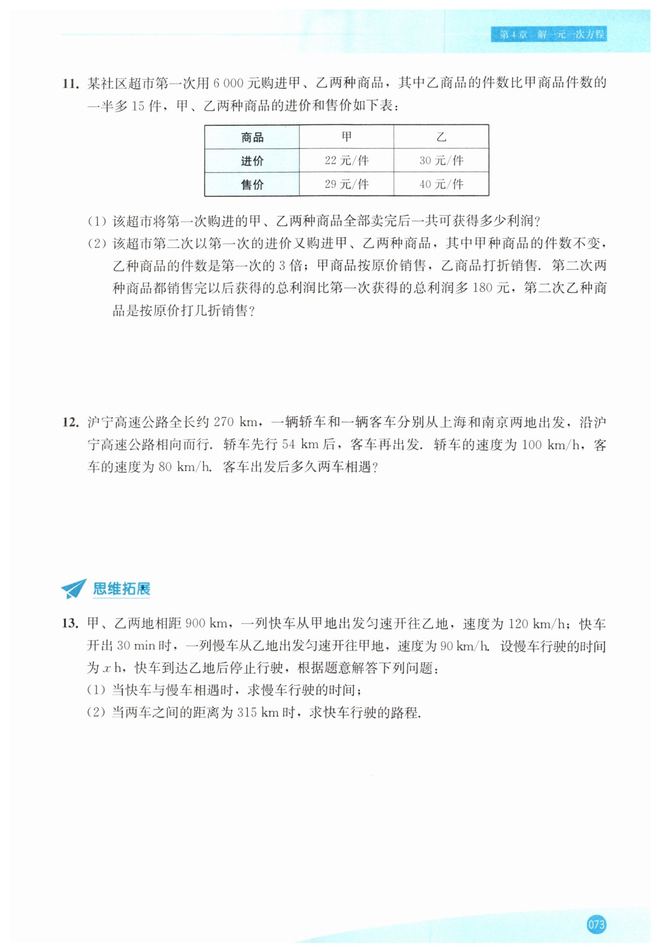 (1)根據(jù)題意,得$120(x + 0.5) + 90x = 900$,解得$x = 4$。答:慢車行駛的時(shí)間為$4\ h$。