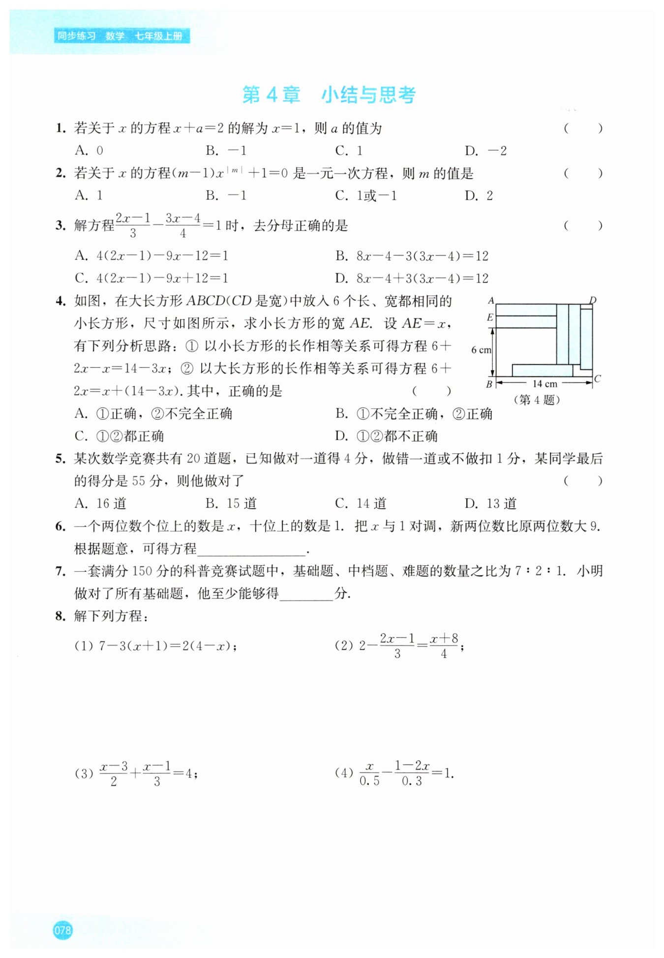 分析②:大長方形的長$AD$有兩種表示方法:一是$y + 2x$(上方兩個(gè)小長方形的寬與一個(gè)小長方形的長),二是$x + 14$(左側(cè)小長方形的寬與下方大長方形的長$14$)。因此,以大長方形的長作相等關(guān)系可得$y + 2x = x + 14$,即$y + x = 14$。而題目中②的方程為$6 + 2x = x + (14 - 3x)$,化簡后為$6 + 2x = 14 - 2x$,與正確方程$y + x = 14$(其中$y = 6 + x$,代入得$6 + x + x = 14$,即$6 + 2x = 14$)不一致,故②不完全正確。