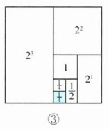 $(3)\frac{63}{4},圖不唯一,如圖③,該式可以表示為圖③中去掉陰影區(qū)域(面積為\frac{1}{4})的面積,即2^{4}-\frac{1}{4}=\frac{63}{4}$