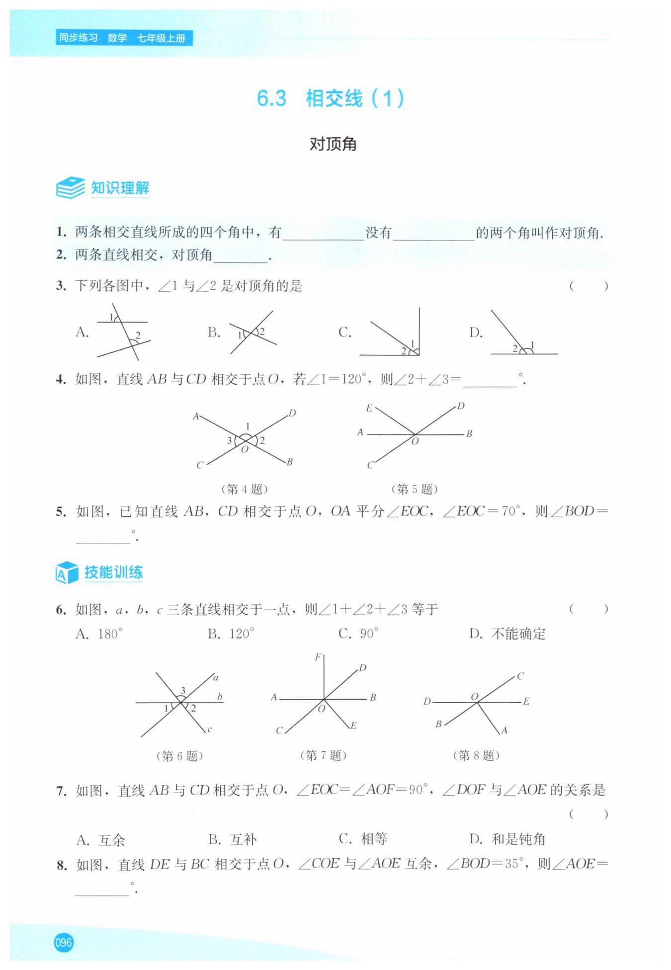 由對(duì)頂角相等可知,∠1的對(duì)頂角與∠1相等,∠2的對(duì)頂角與∠2相等,∠3的對(duì)頂角與∠3相等。
