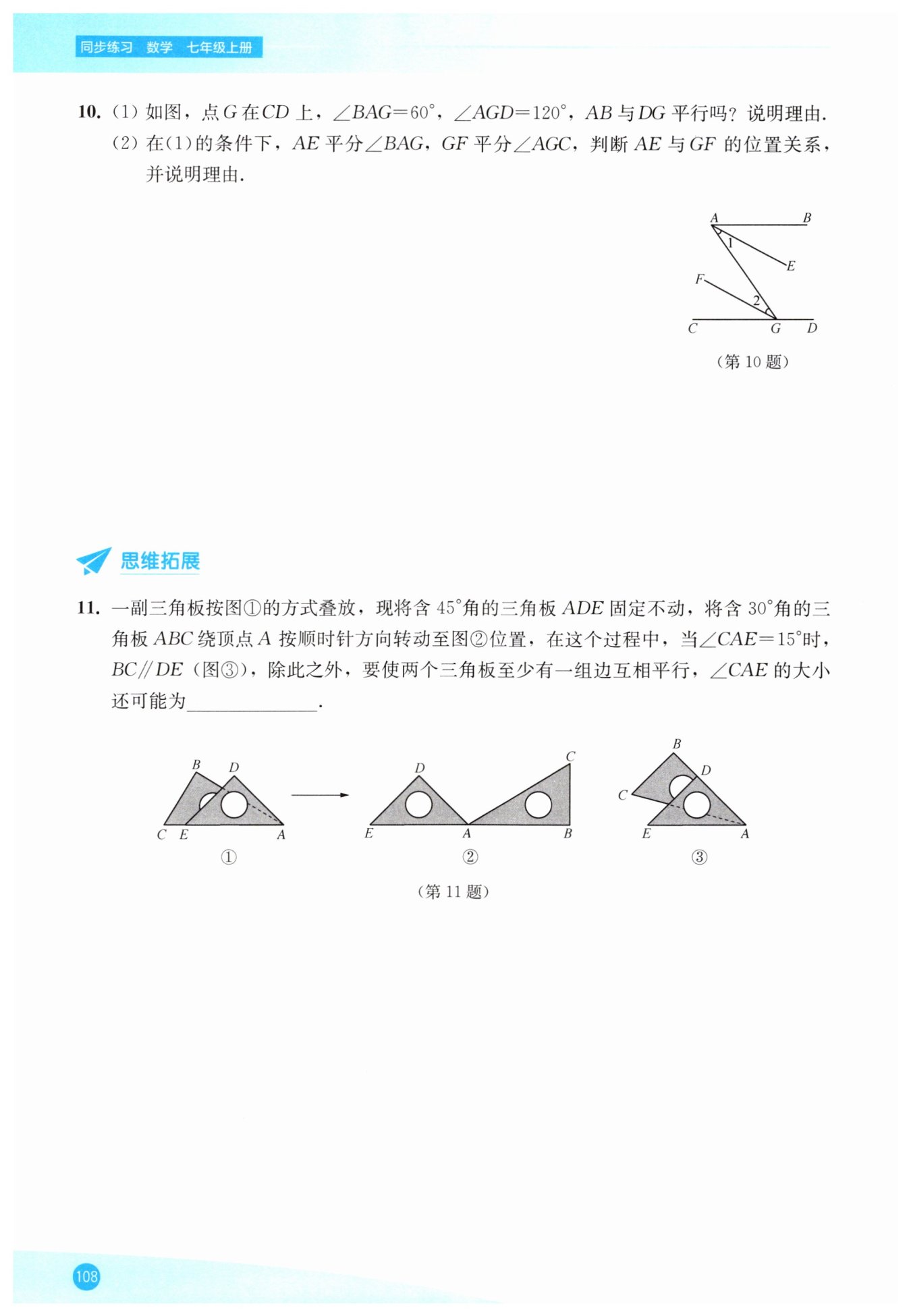 (2)AE與GF平行,理由如下:由(1)知AB//DG,所以∠BAG=∠AGC(兩直線平行,內(nèi)錯(cuò)角相等)。