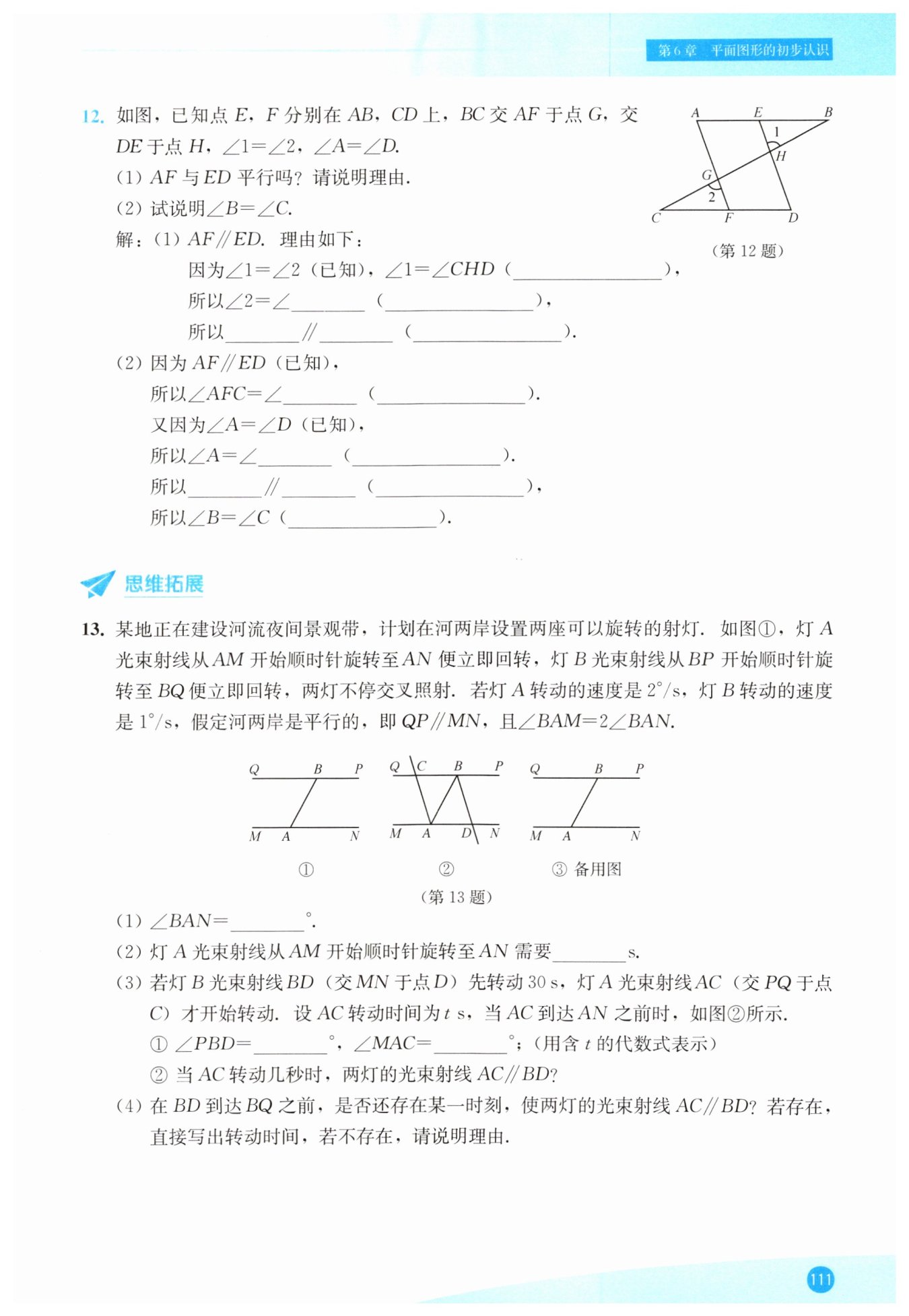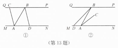 (1) 60 (2) 90 (3) ① t+30,2t ② 設(shè)A燈轉(zhuǎn)動t s,當(dāng)AC到達(dá)AN之前, 即0<t<90時(shí),兩燈的光束互相平行, 理由如下:如圖①:因?yàn)镻Q∥MN, 所以∠PBD=∠BDA, 因?yàn)锳C∥BD, 所以∠CAM=∠BDA, 所以∠CAM=∠PBD. 所以2t=1×(30+t),解得t=30 (4) BD到達(dá)BQ之前,即90<t<150時(shí),還存在某一時(shí)刻,使兩燈的光束射線AC∥BD, 如圖②:因?yàn)镻Q∥MN, 所以∠PBD+∠BDA=180°, 因?yàn)锳C∥BD, 所以∠CAN=∠BDA. 所以∠PBD+∠CAN=180°. 所以1×(30+t)+(2t-180)=180,解得t=110