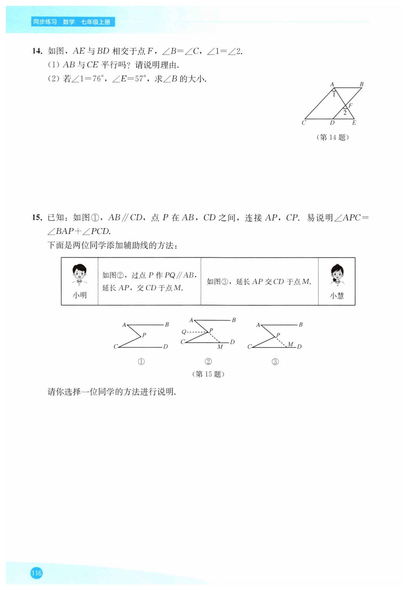 以選擇小明的方法為例,證明如下:因?yàn)?AB//PQ,所以∠APQ=∠BAP,又因?yàn)椤螧AP=∠PMC,所以∠APQ=∠PMC,所以 PQ//CD,所以∠CPQ=∠PCD,所以∠APQ+∠CPQ=∠BAP+∠PCD,即∠APC=∠BAP+∠PCD