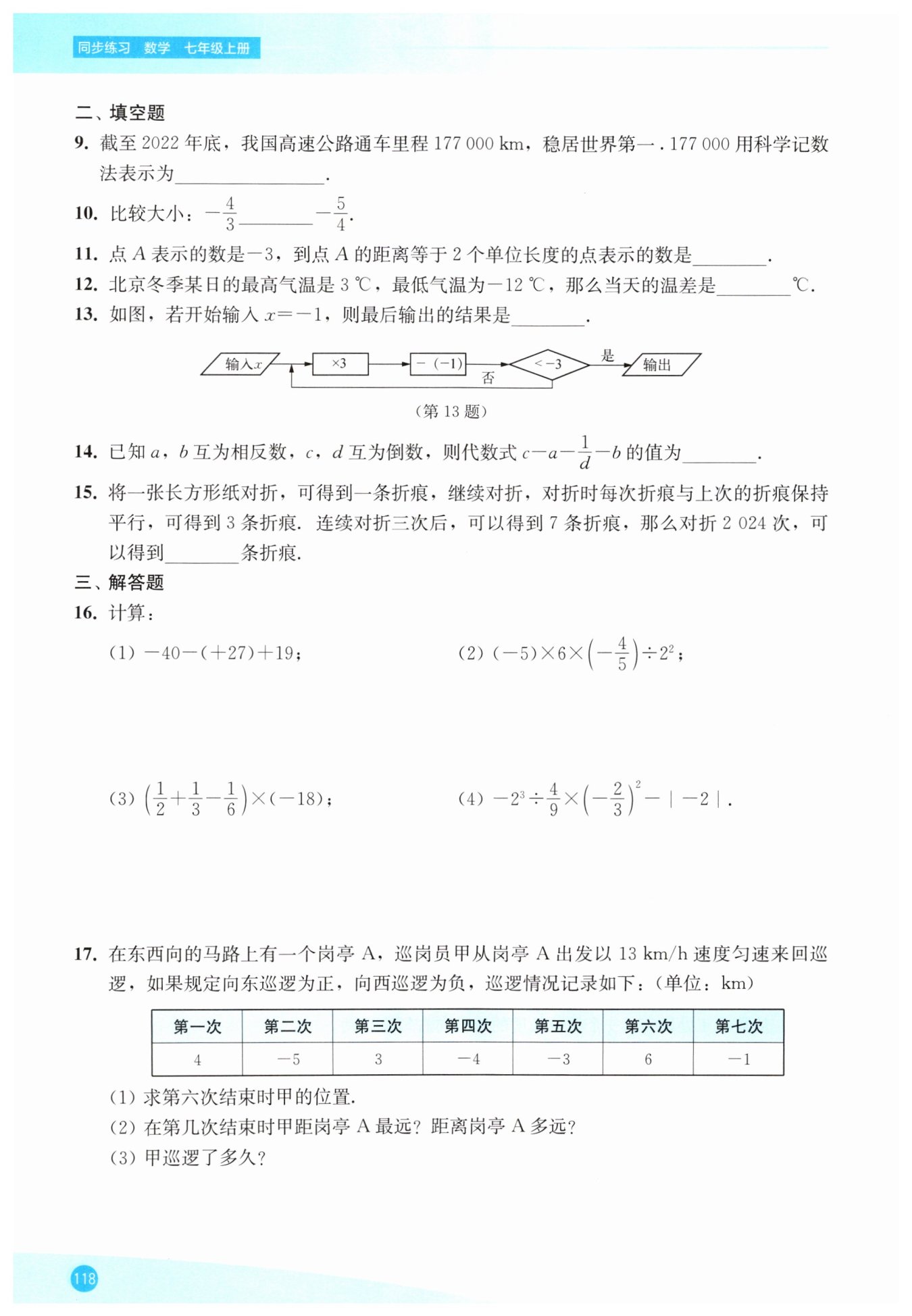 (1)$4+(-5)+3+(-4)+(-3)+6=1(km)$.答:在崗亭A東邊1 km處 (2)在第五次記錄時距離亭A最遠,距離A 5 km (3)$|4|+|-5|+|3|+|-4|+|-3|+|6|+|-1|=26(km),26÷ 13=2(h)$.答:甲巡邏了2 h