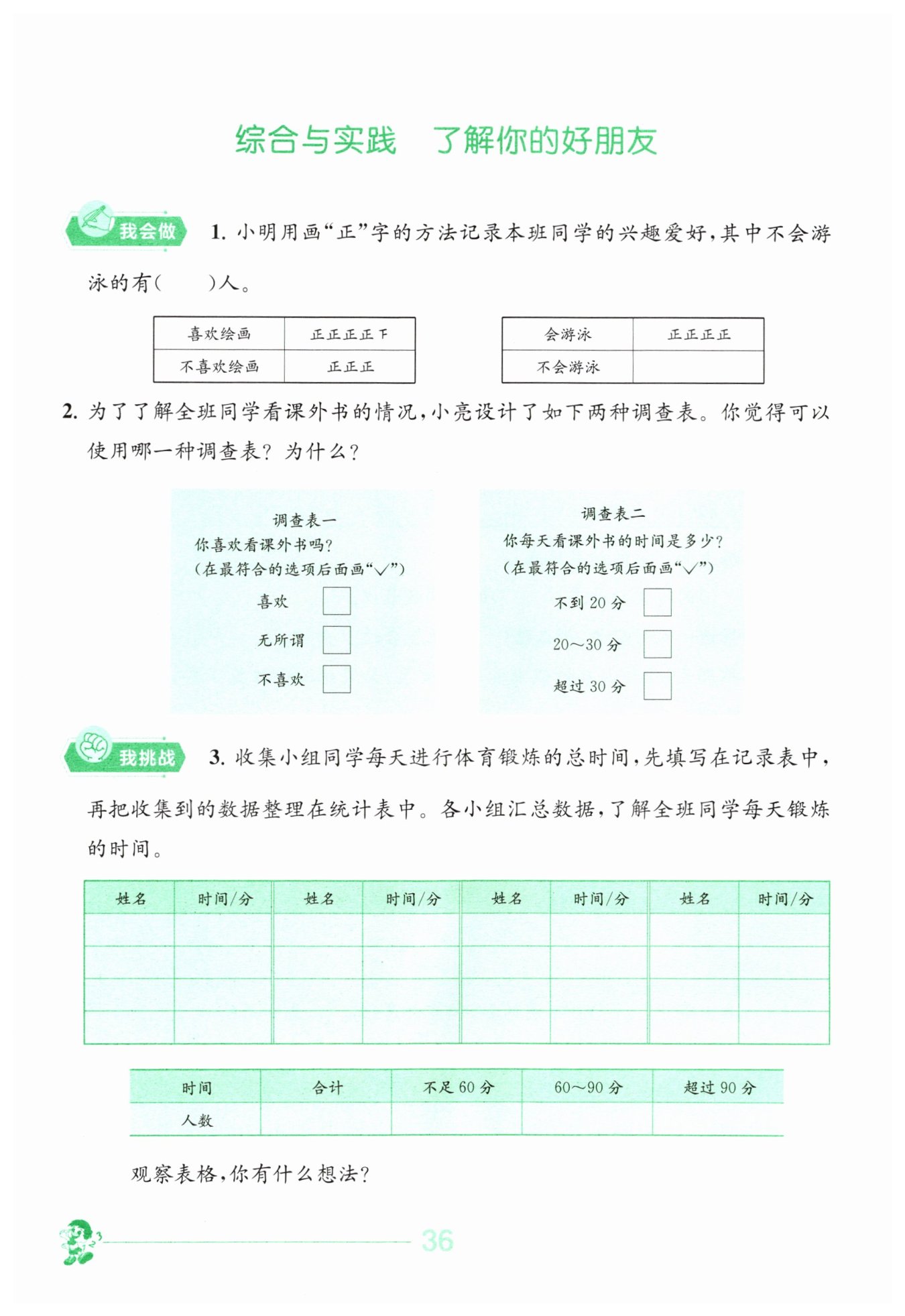具體地反映全班同學(xué)看課外書的實(shí)際情況;而調(diào)查表一僅調(diào)查是否喜歡看課外書,無法