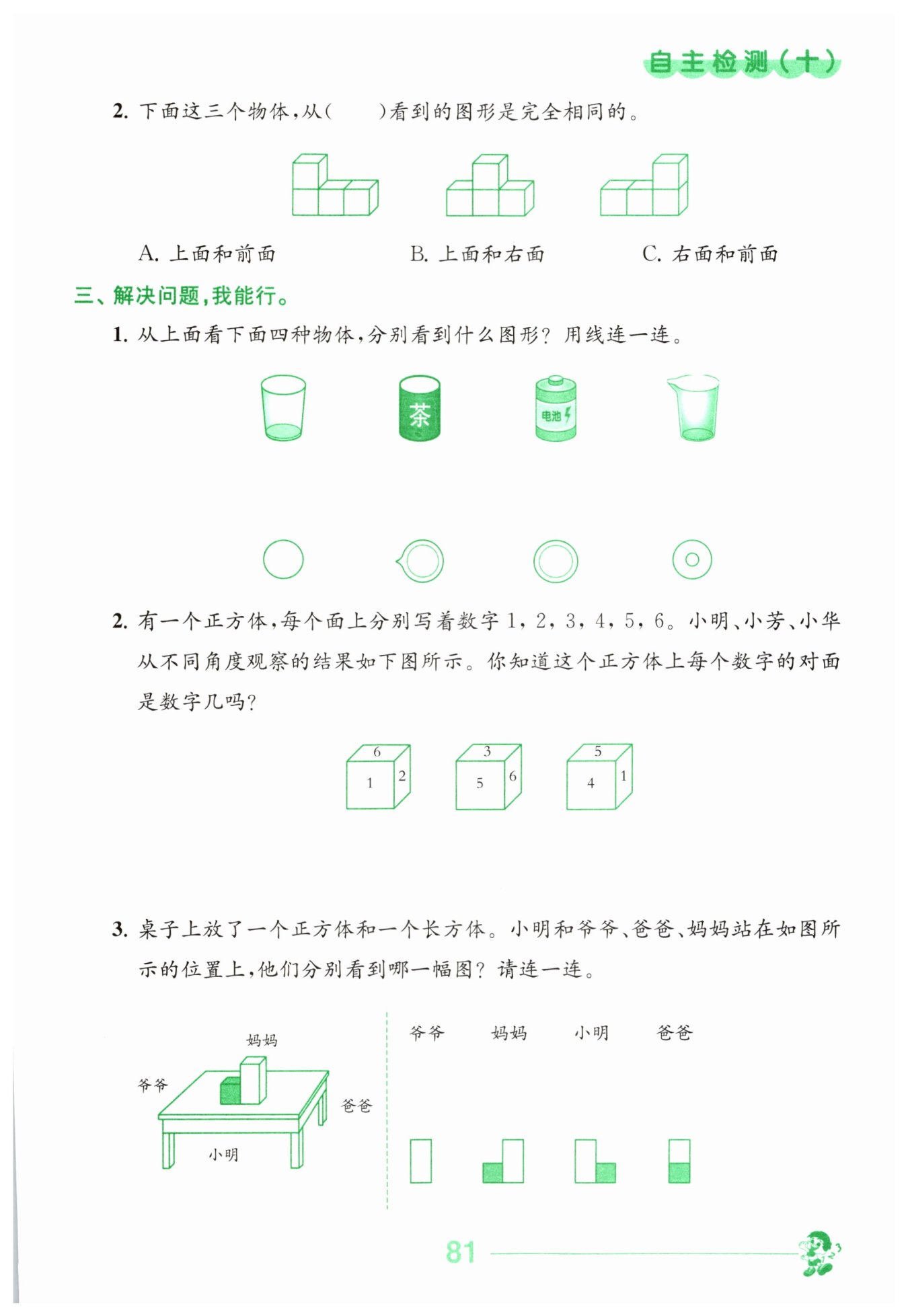 答:1的對面是3,2的對面是5,6的對面是4。