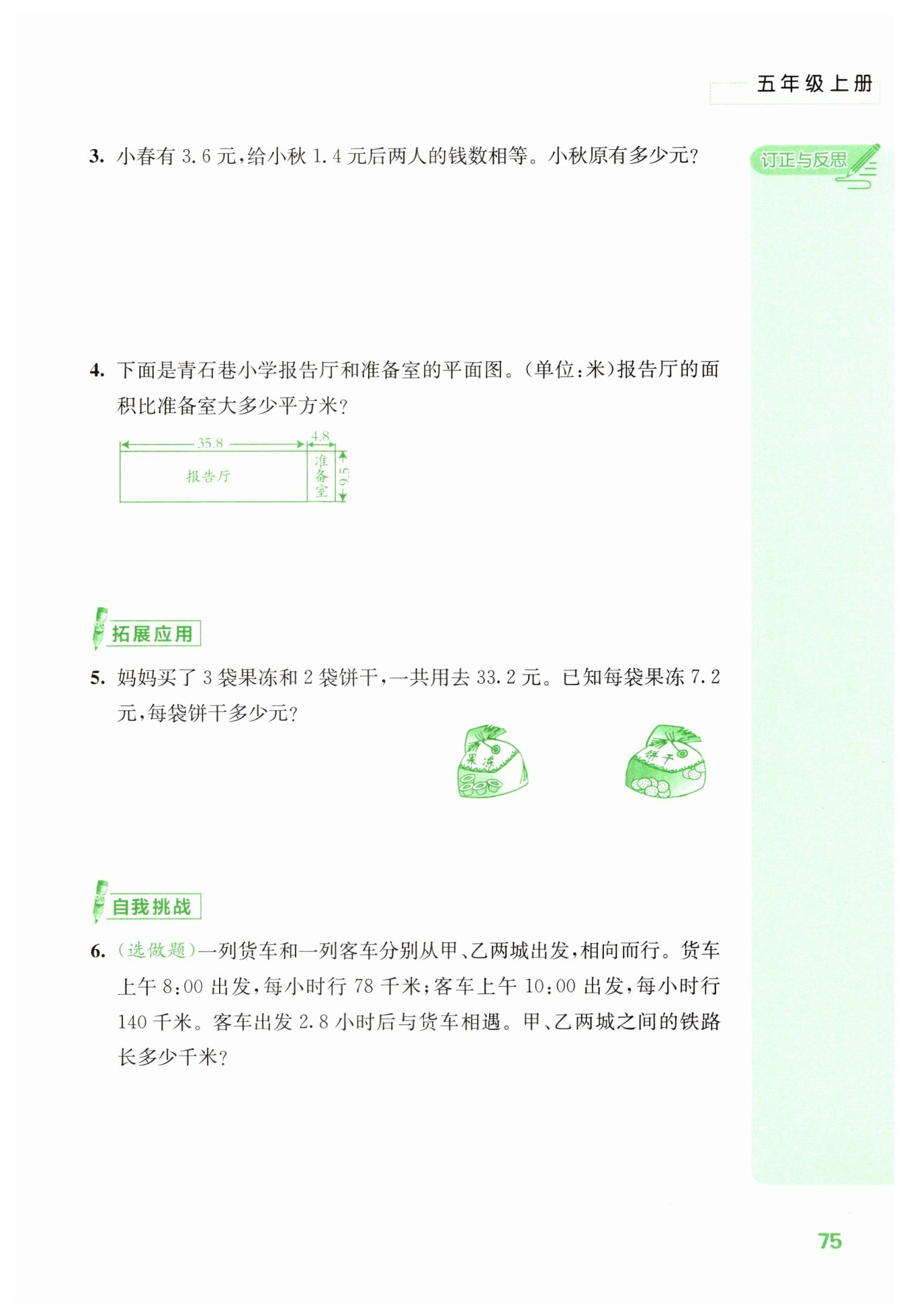 (35.8-4.8) ×9.5=294.5 (平方米 ) 答 ∶ 報(bào)告廳的面積比準(zhǔn)備室大294.5平方米。