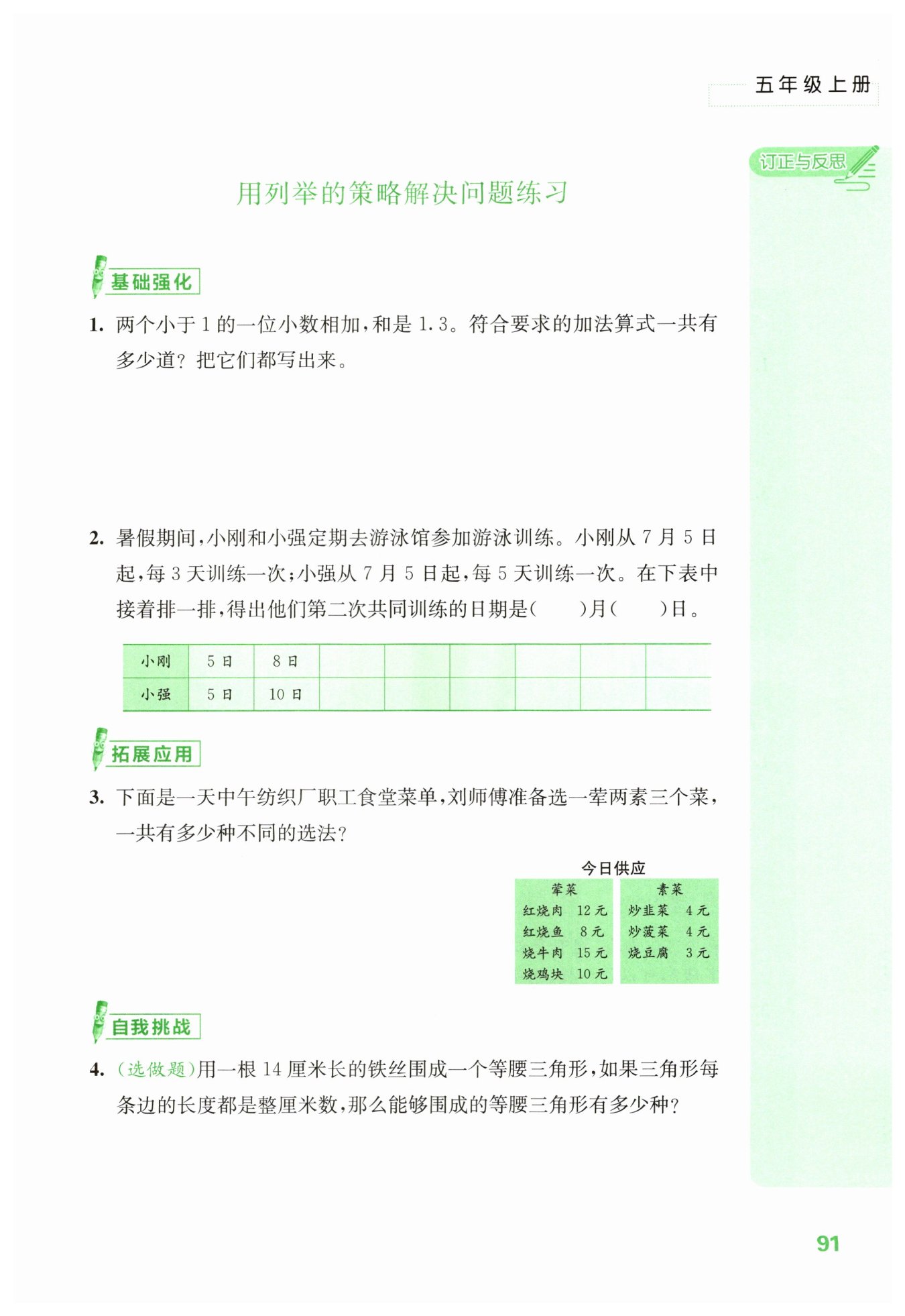 葷菜有4種:紅燒肉、紅燒魚、燒牛肉、燒雞塊。 素菜有3種:炒韭菜、炒菠菜、燒豆腐。 選1葷2素,先選葷菜,再選素菜。 選紅燒肉時(shí),素菜可選:炒韭菜和炒菠菜、炒韭菜和燒豆腐、炒菠菜和燒豆腐,共3種。 選紅燒魚時(shí),素菜同樣有3種選法。 選燒牛肉時(shí),素菜有3種選法。 選燒雞塊時(shí),素菜有3種選法。 總選法:4×3=12(種) 答:一共有12種不同的選法。